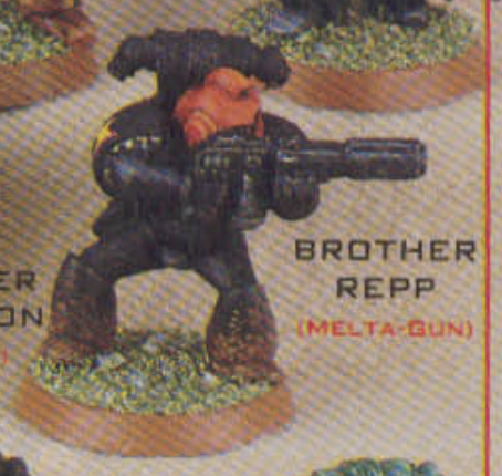 This metal Rogue Trader Space Marine goes by Brother Repp (with Melta Gun) and has 1988 on the tab. He is shown with part number 070106/17 in the 1991 catalogues and is listed as one of those sculpted by Aly Morrison and Mark Copplestone.