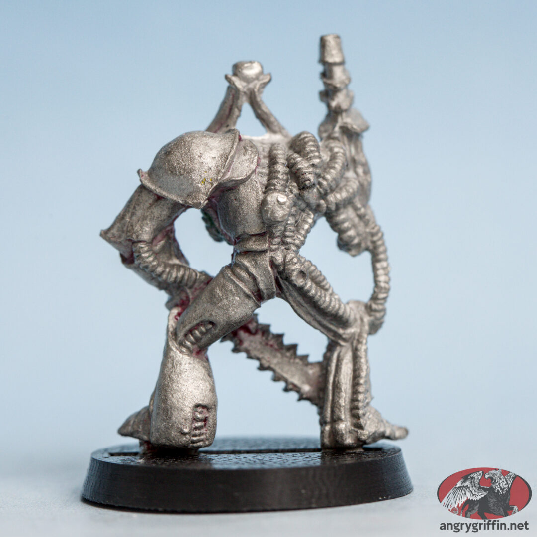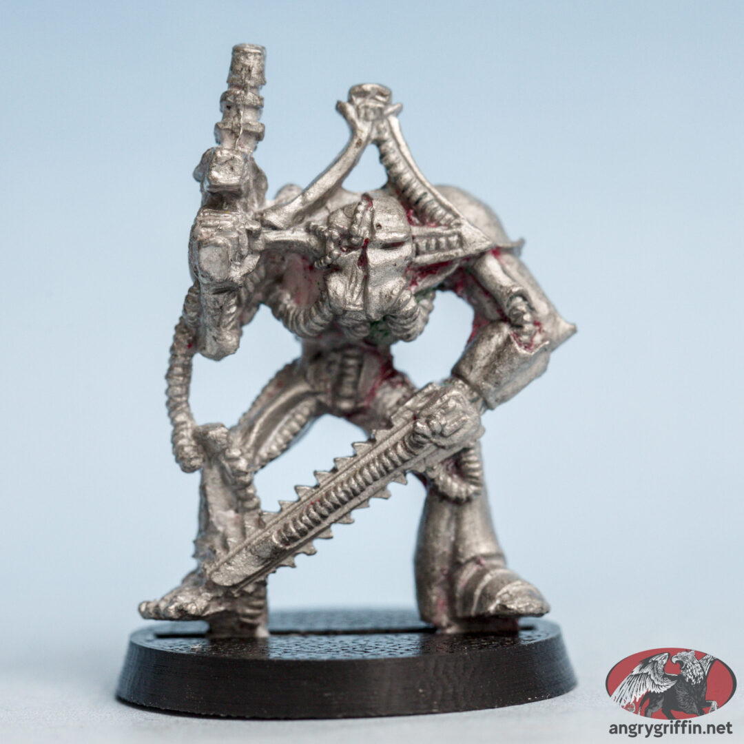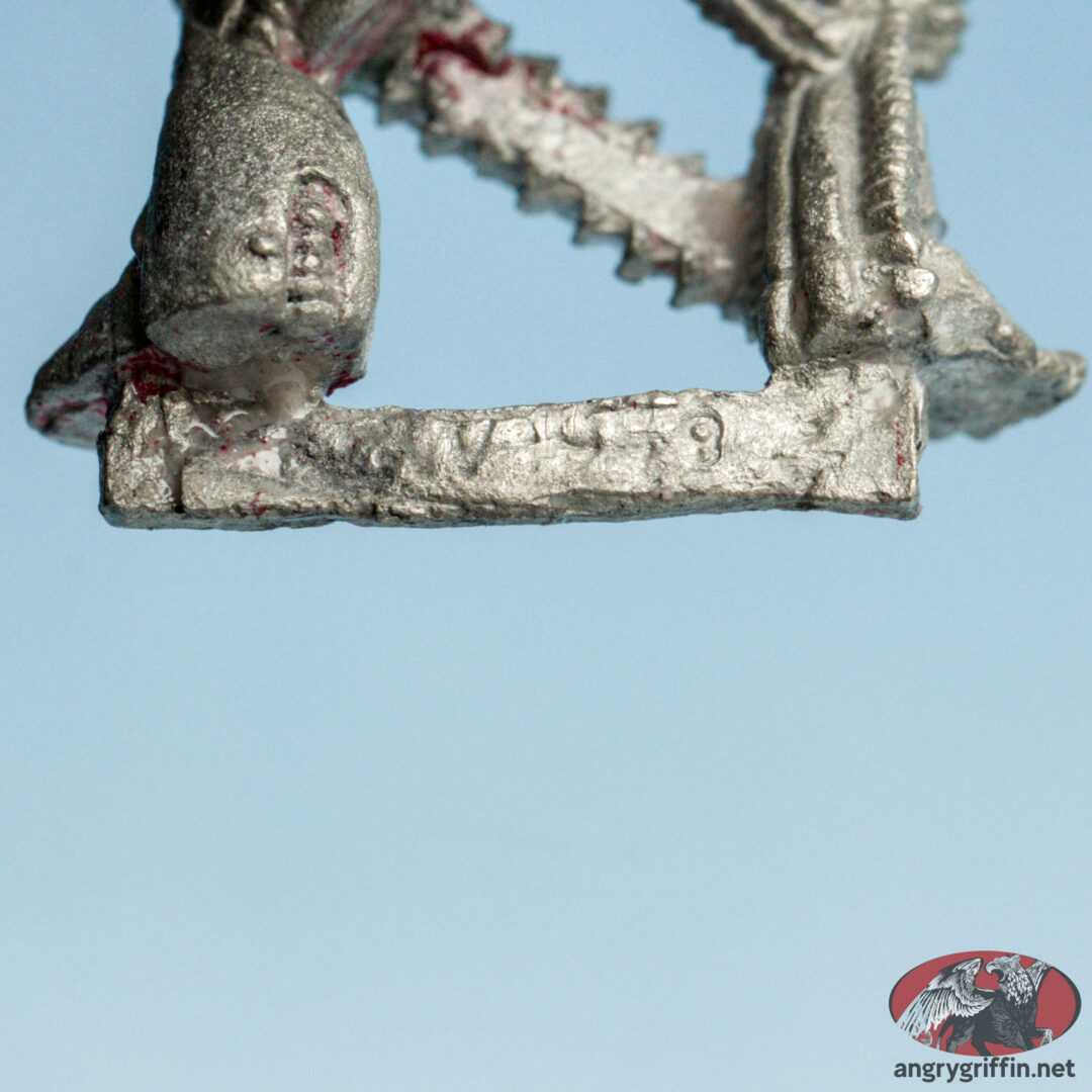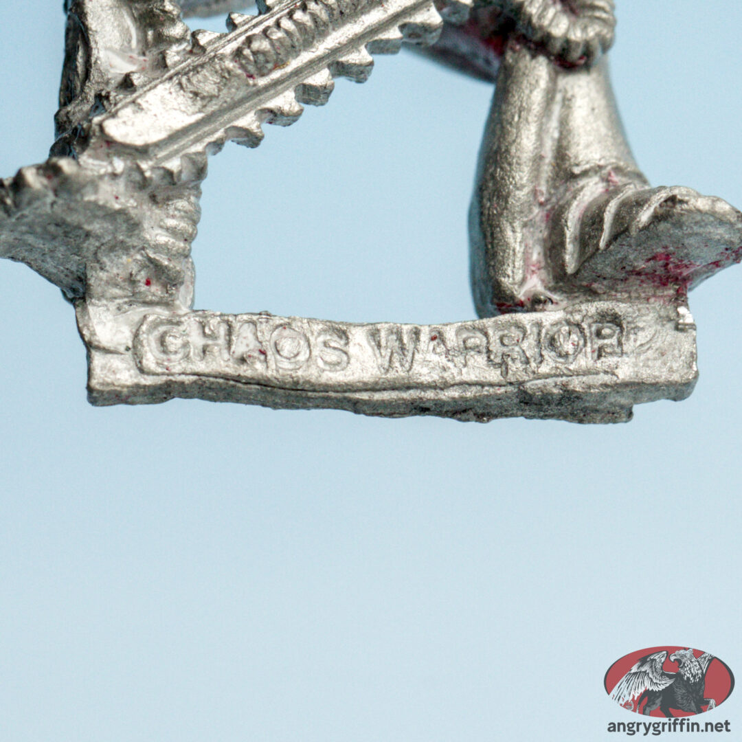 This metal Rogue Trader-era Chaos Renegade miniature is seen in the 1989 catalogue as part number 022216. Sculpting credits for that page go to Michael Perry and Kevin Adams, and I don’t know which one sculpted this particular chap.