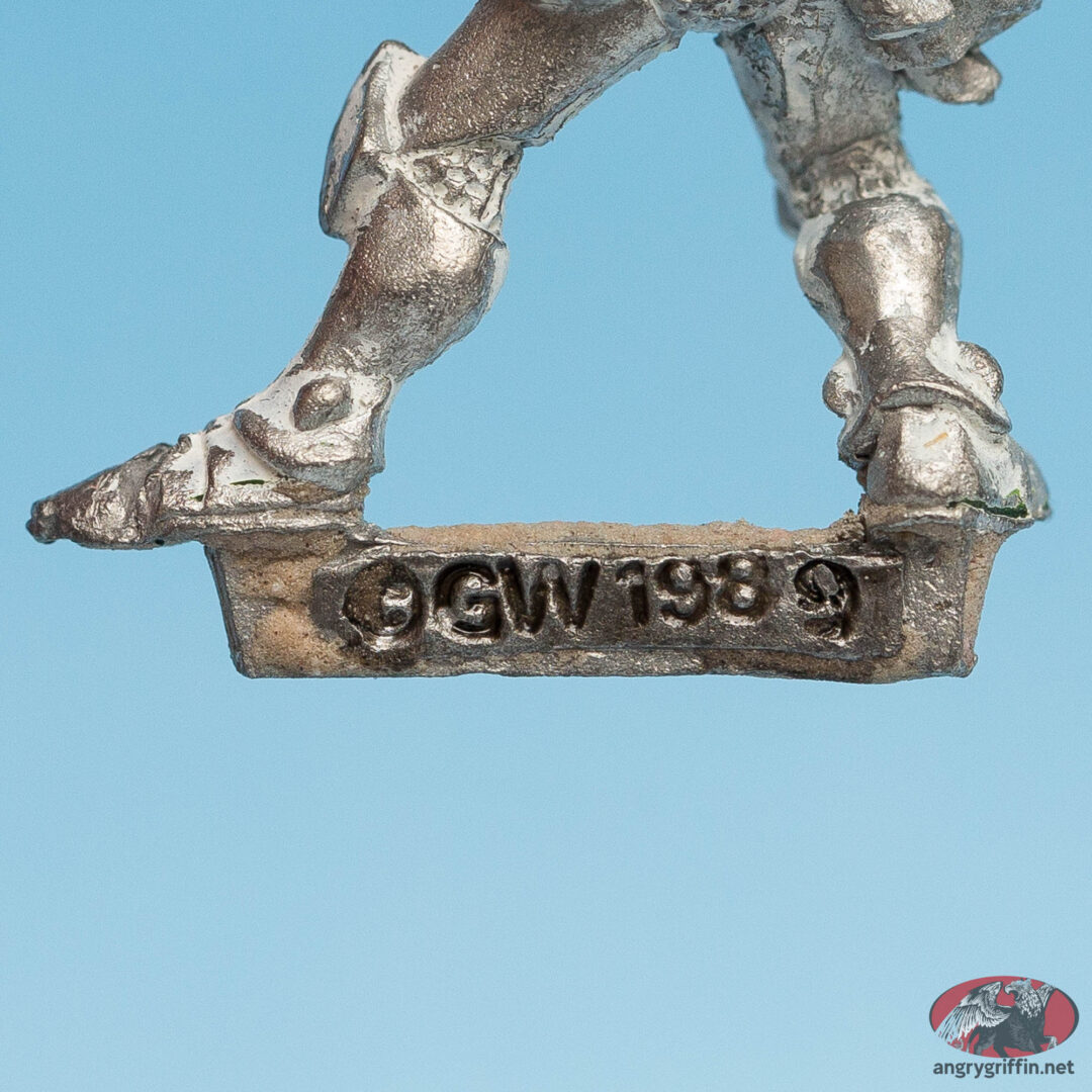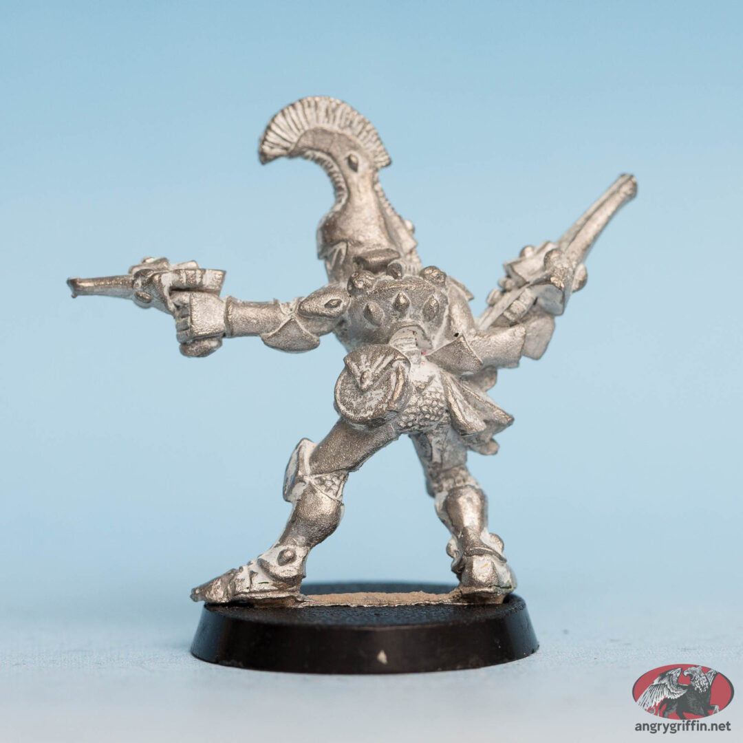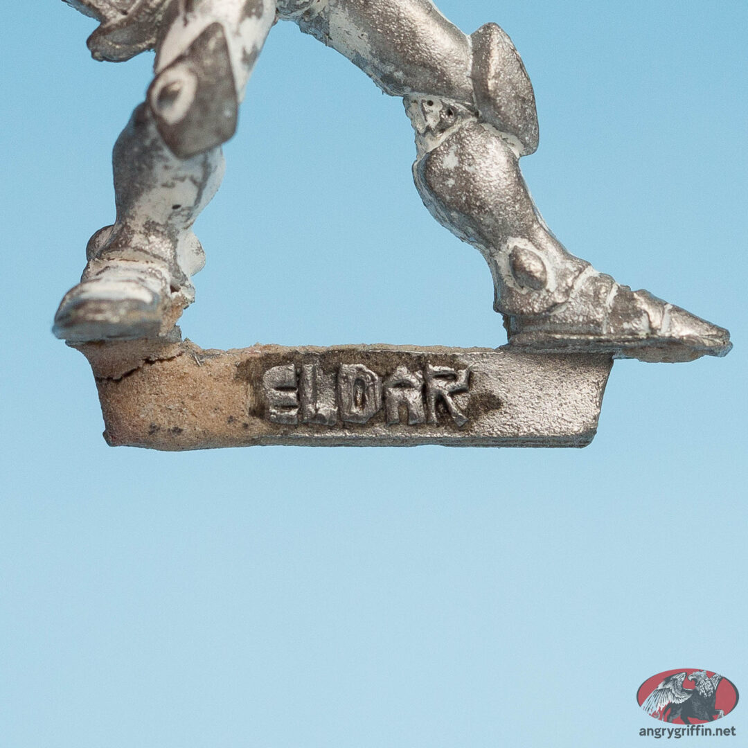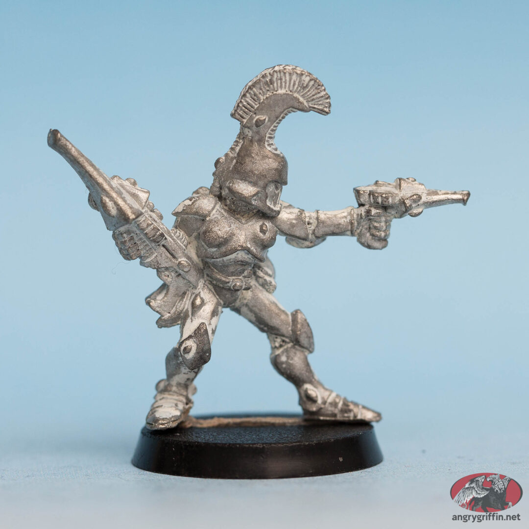 This metal Rogue Trader Eldar Guardian is armed with a Shuriken Catapult and Shuriken Pistol, and was sculpted in 1989 by Jes Goodwin.