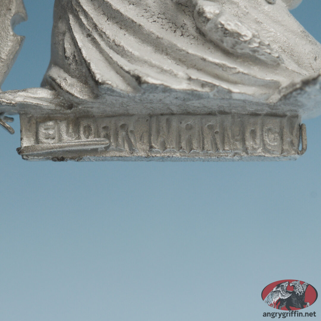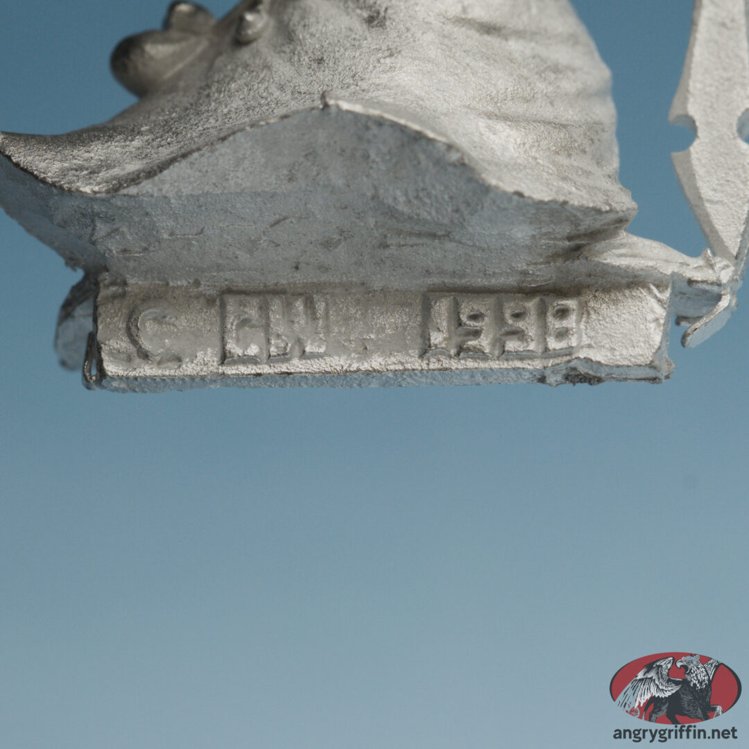 This metal 3rd. Edition Warhammer 40K Eldar miniature was the Warlock with Witch Blade 4. It appears in the 2000 catalogue as part number 010406401. The page is credited to both Jes Goodwin and Mike McVey, and I’m not sure which sculpted this particular miniature. It’s a 1998 sculpt according to the tab.