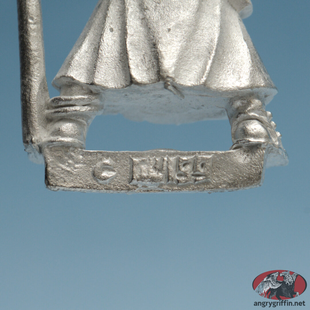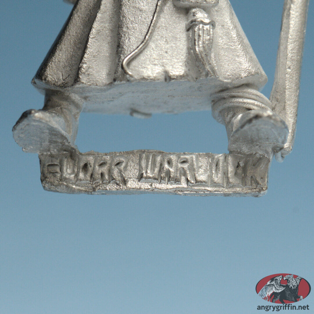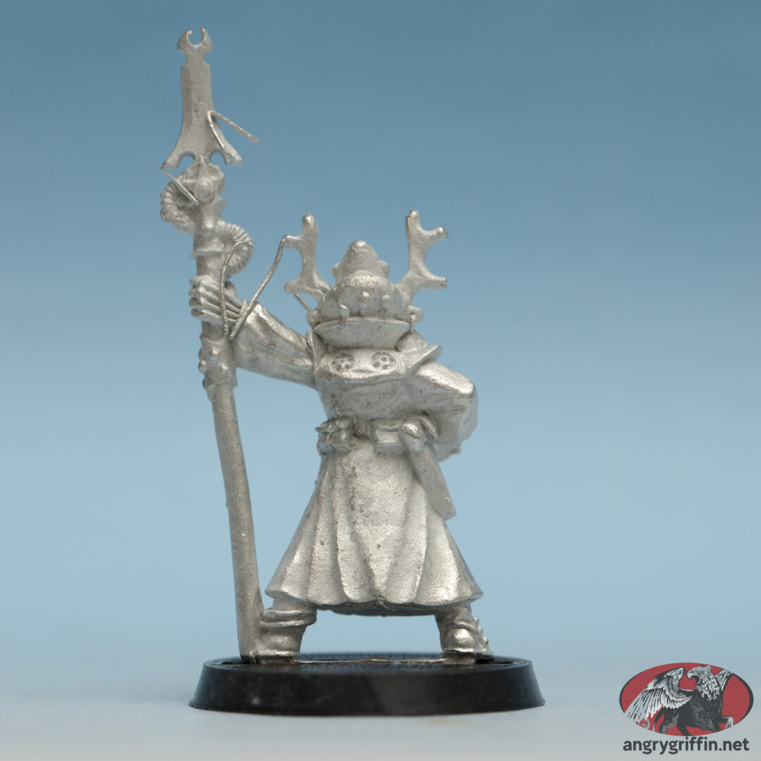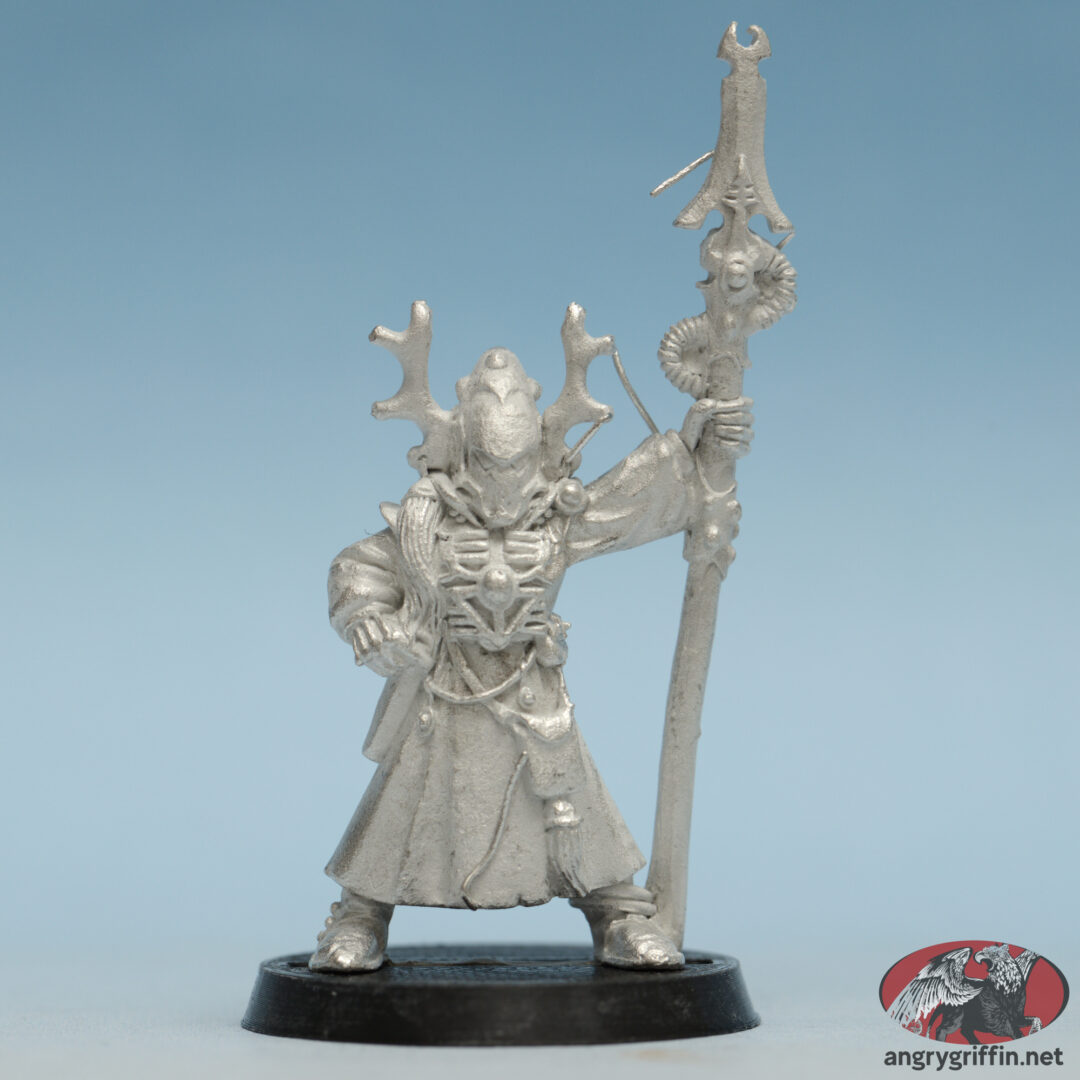 This Rogue Trader-era Eldar Warlock with Force Staff was a 1990 Jes Goodwin sculpt, appearing in the 1991 Blue catalogue with credit.