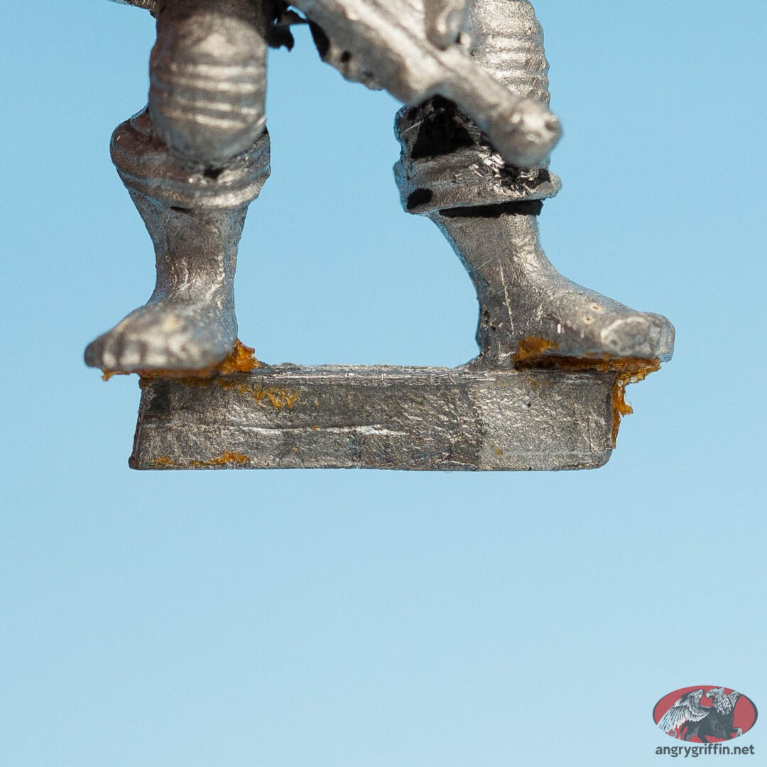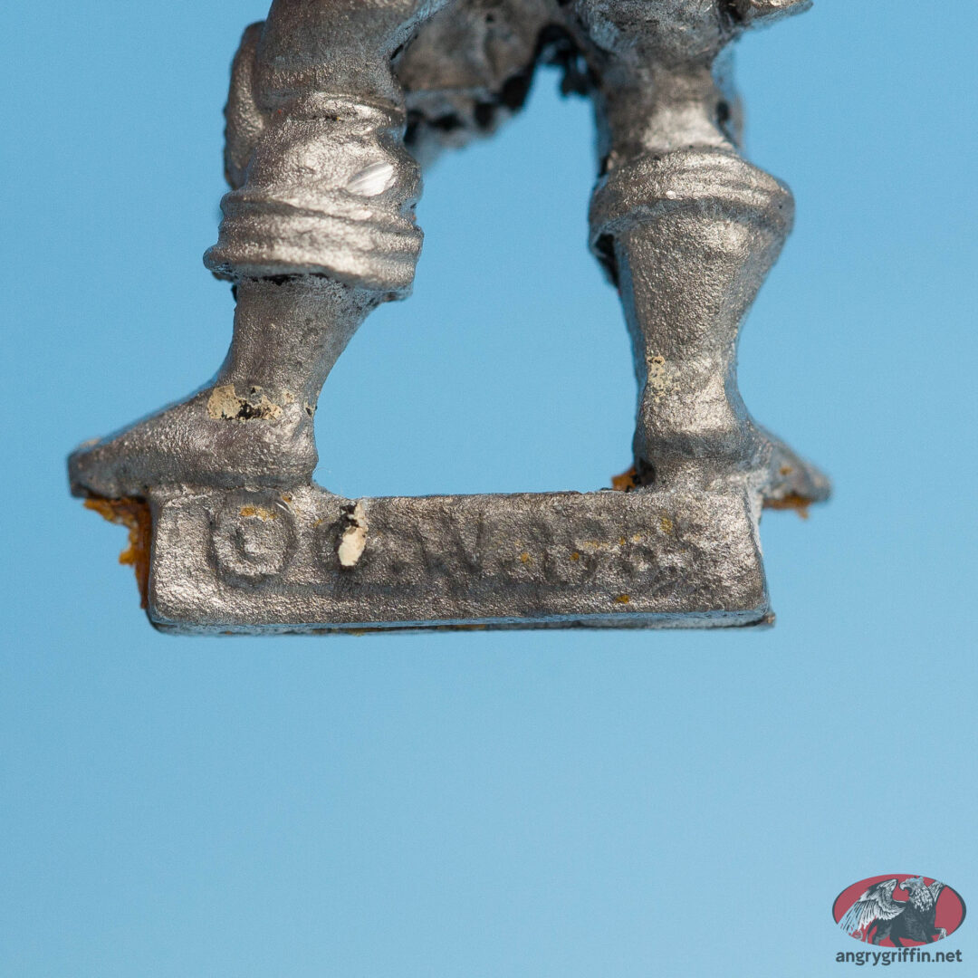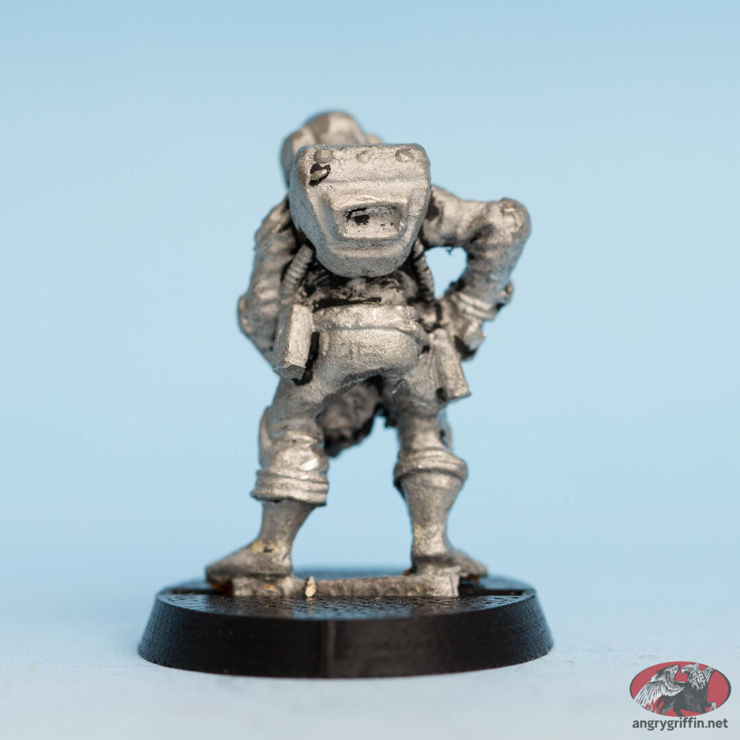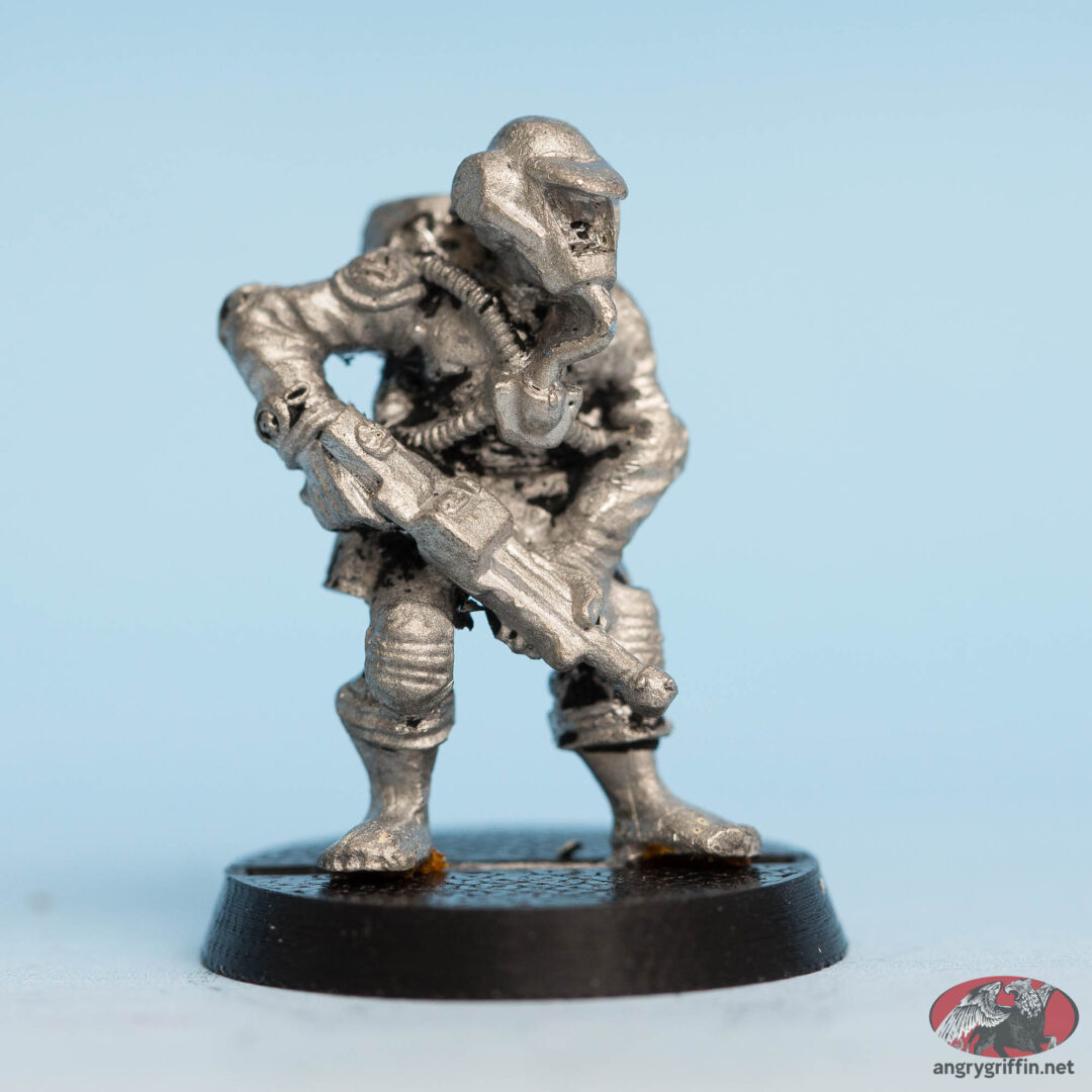 This metal miniature is one of the first releases from Warhammer 40K: Rogue Trader, and was sculpted by Bob Naismith in 1985. He went by “Ground Combat Trooper”.