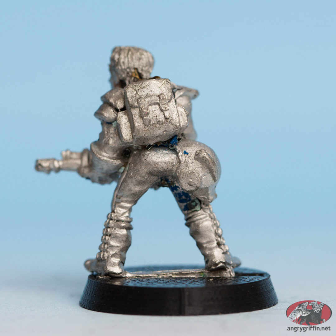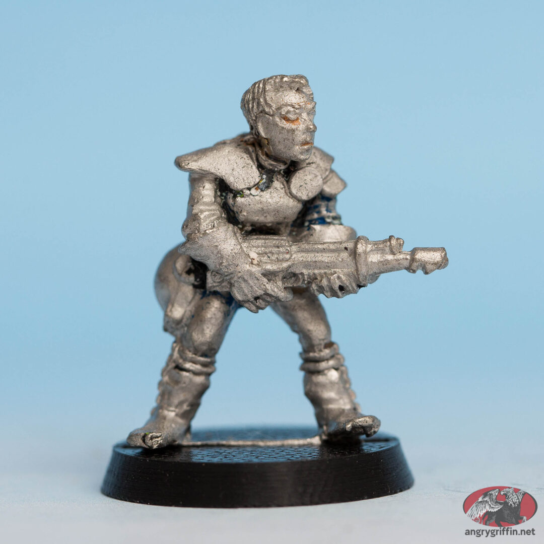 Female Trooper Vaskez (someone had been watching Alien) was one of the Rogue Trader sculpts for the Imperial Army (later Imperial Guard). She is an Aly Morrison sculpt from 1987.