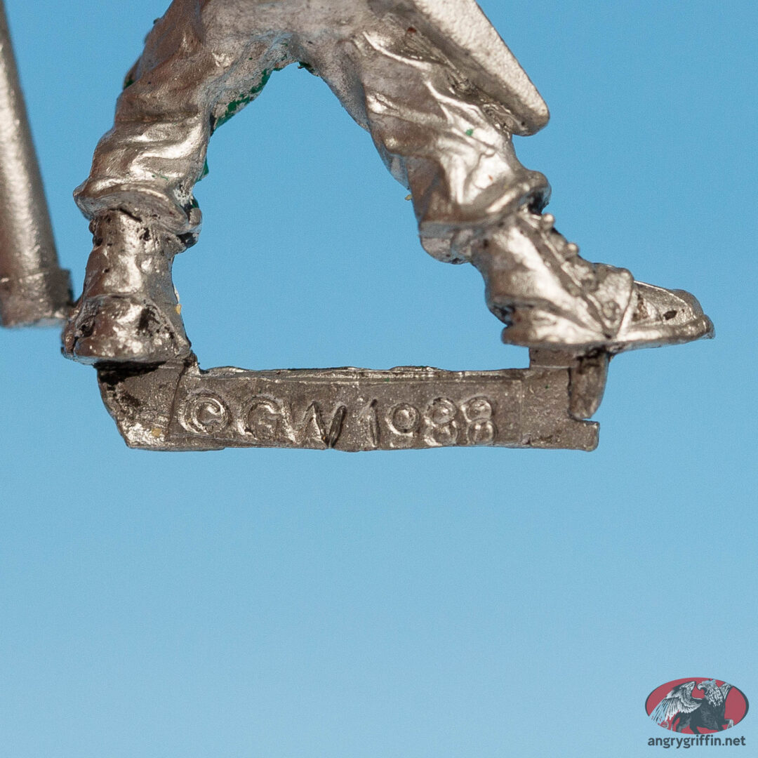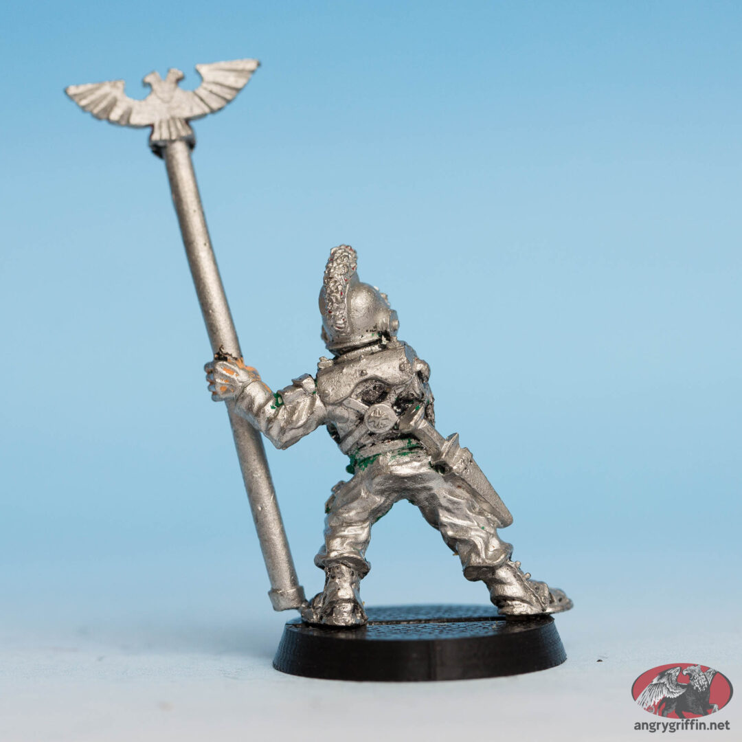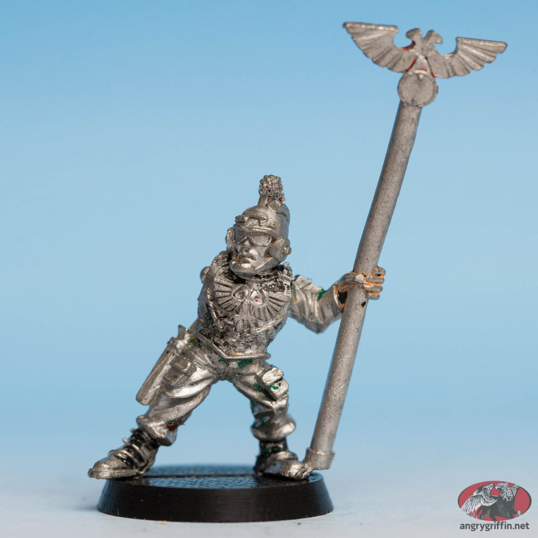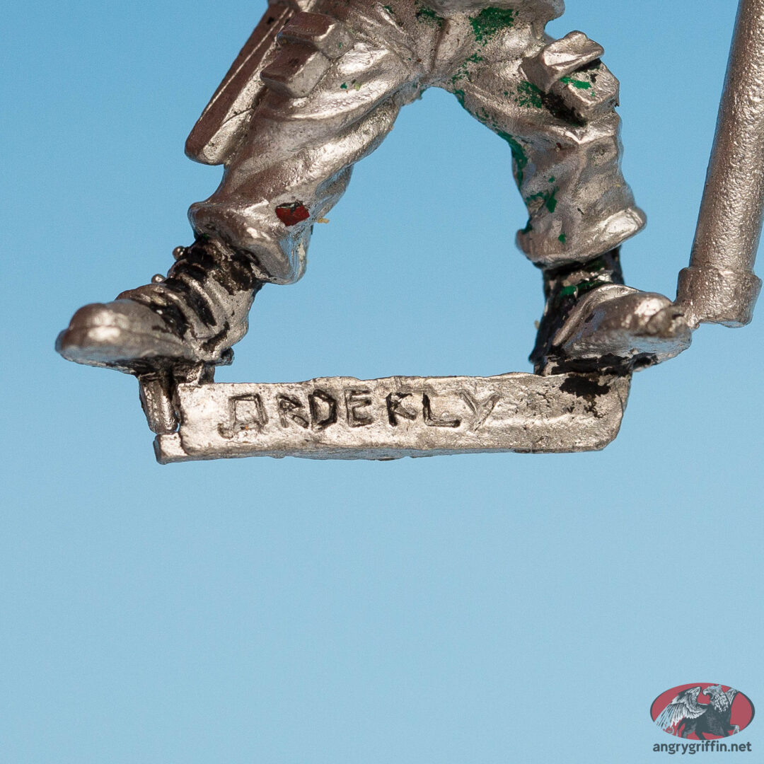 This metal Rogue Trader-era Imperial Guard Orderly was a Mark Copplestone sculpt for the Army/Guard in Rogue Trader. He was part number 401008.
