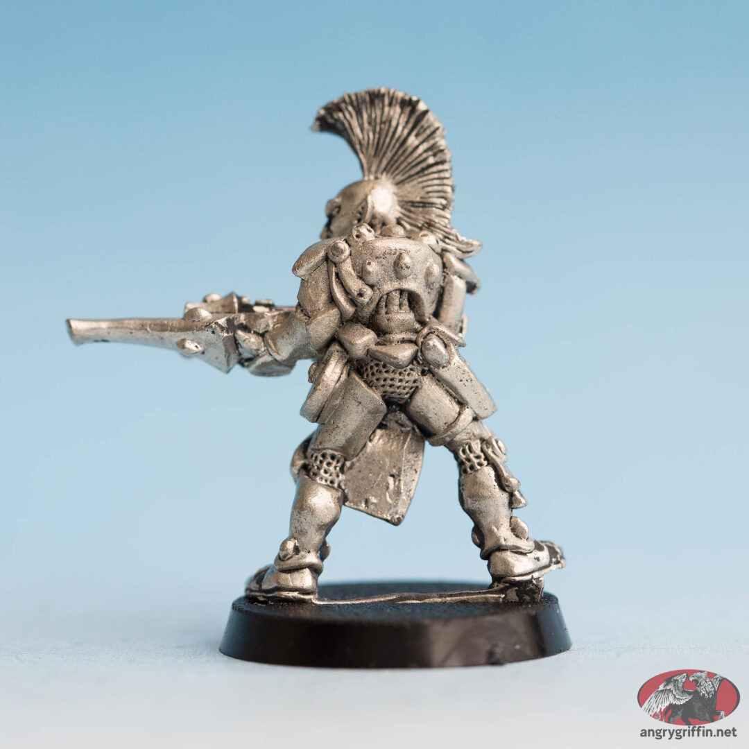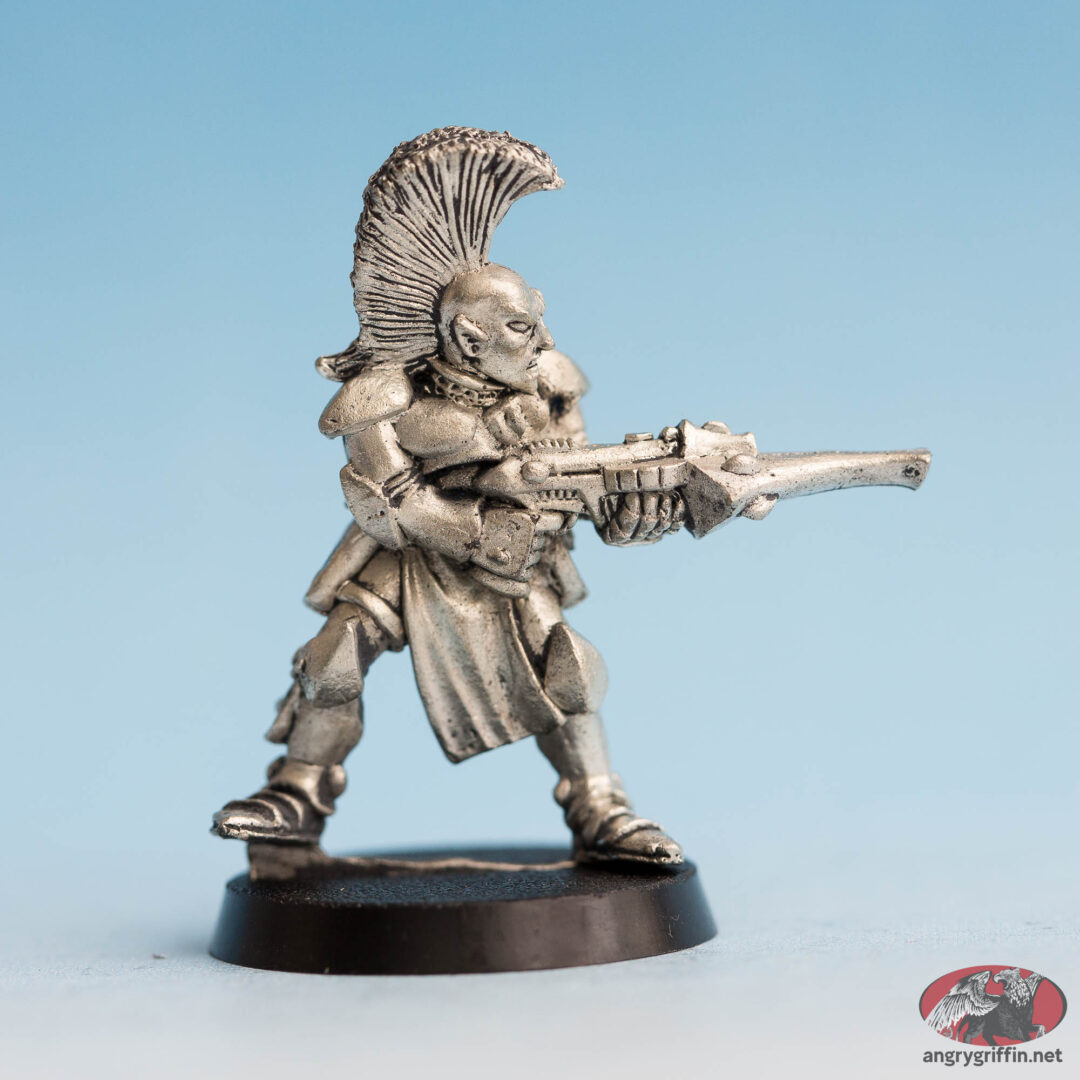 This Rogue Trader-era Eldar Guardian with Shuriken Catapult is a 1989 Jes Goodwin sculpt, and was part number 071584/9 in the later catalogues.