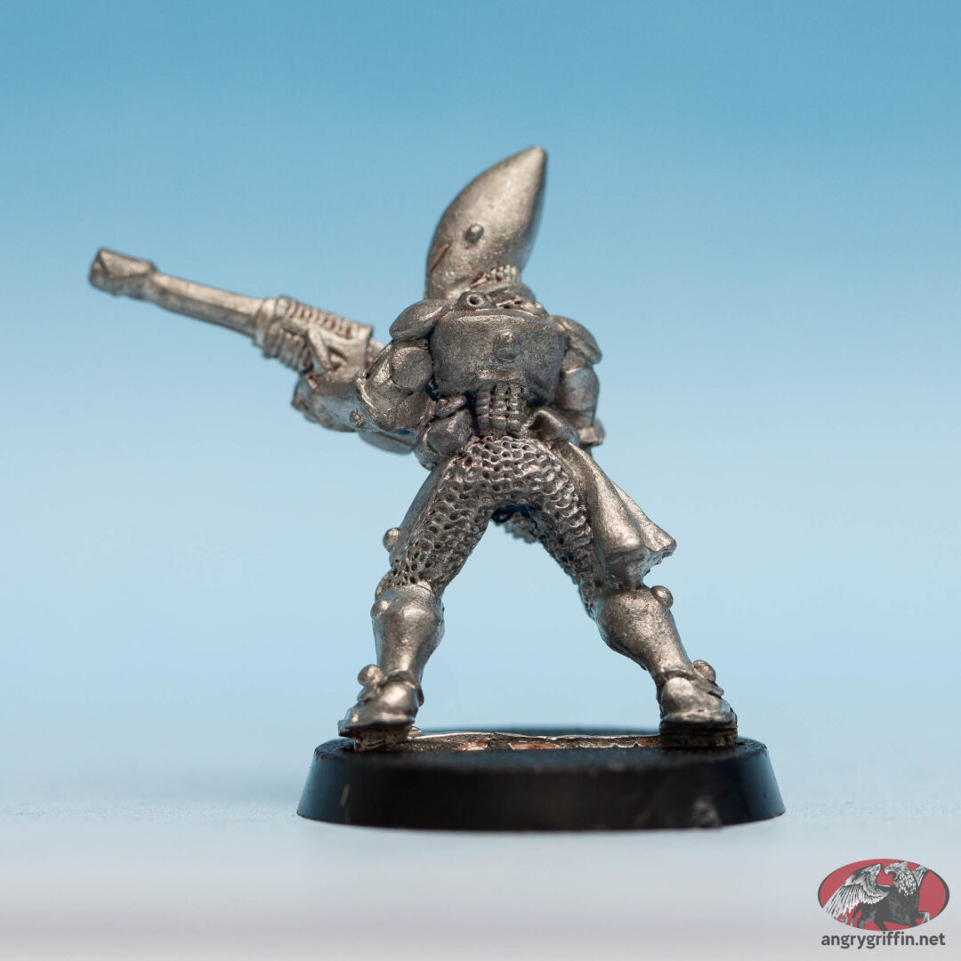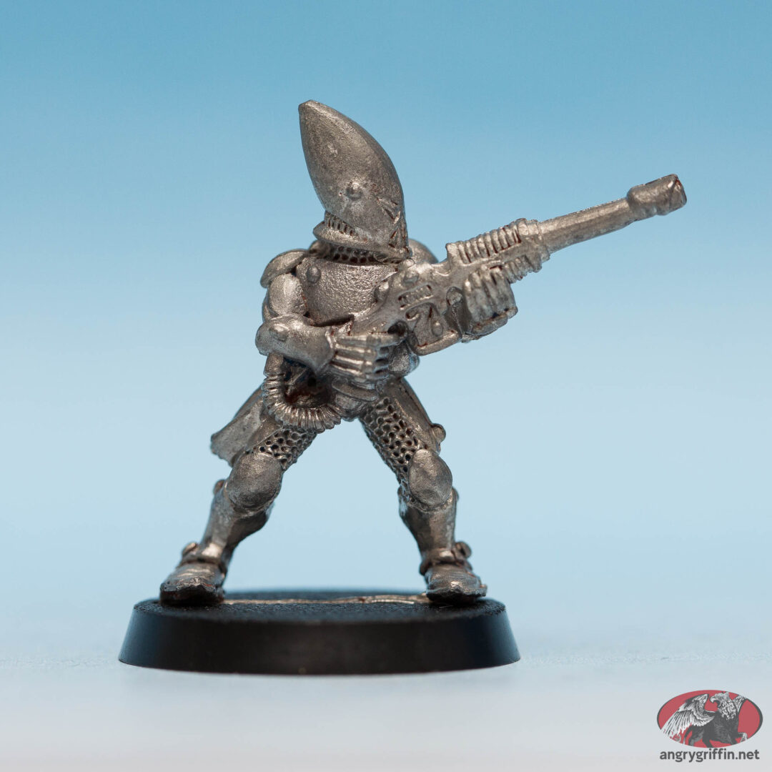 This is a 1990 Jes Goodwin sculpt of an Eldar Guardian with Las Gun. In the 1991 catalogue it’s shown as part number 071584/5.