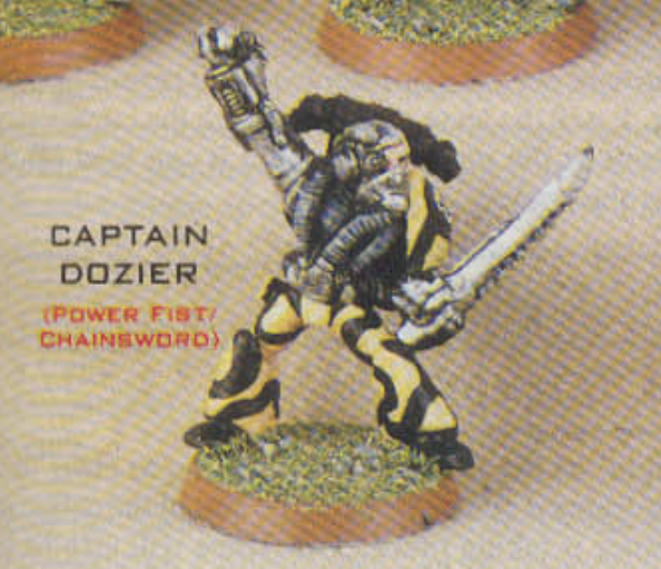 This metal Rogue Trader-era Space Marine was called Captain Dozier. No tab on this guy, unfortunately! He goes by Bionic Eye and Chainsword, part number 070119/35, in the 1991 catalogue. Thanks for sending him to me, Sebastian!