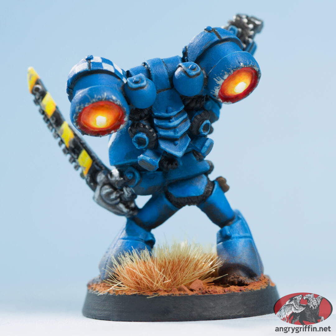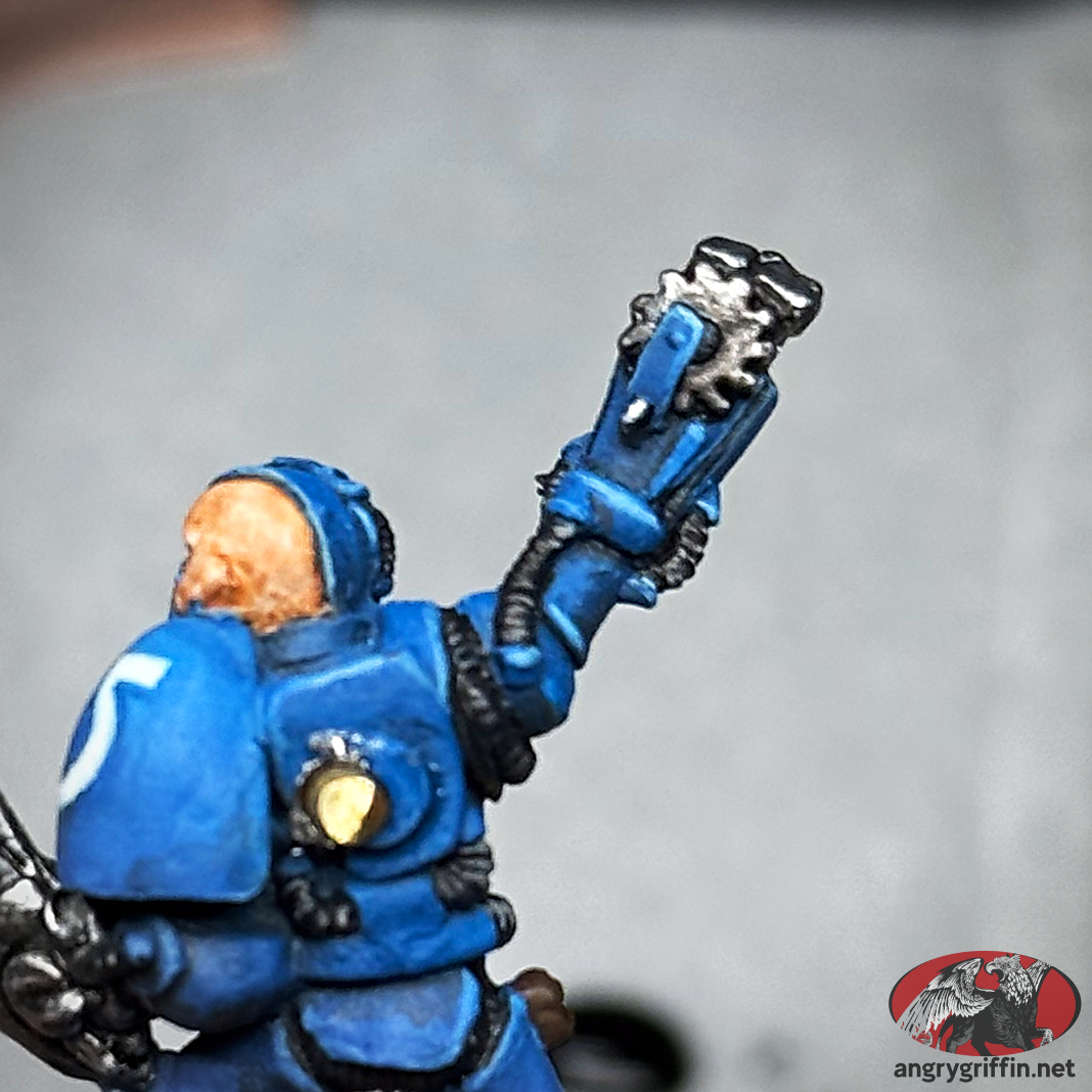 - Yellow: Kimera’s Cold Yellow mixed with The White and Orange for the chainsword. Right knee logo was Cold Yellow mixed with Kimera’s Purple to bring it closer to the army symbol shown in the 2nd. Ed. Ultramarines codex.