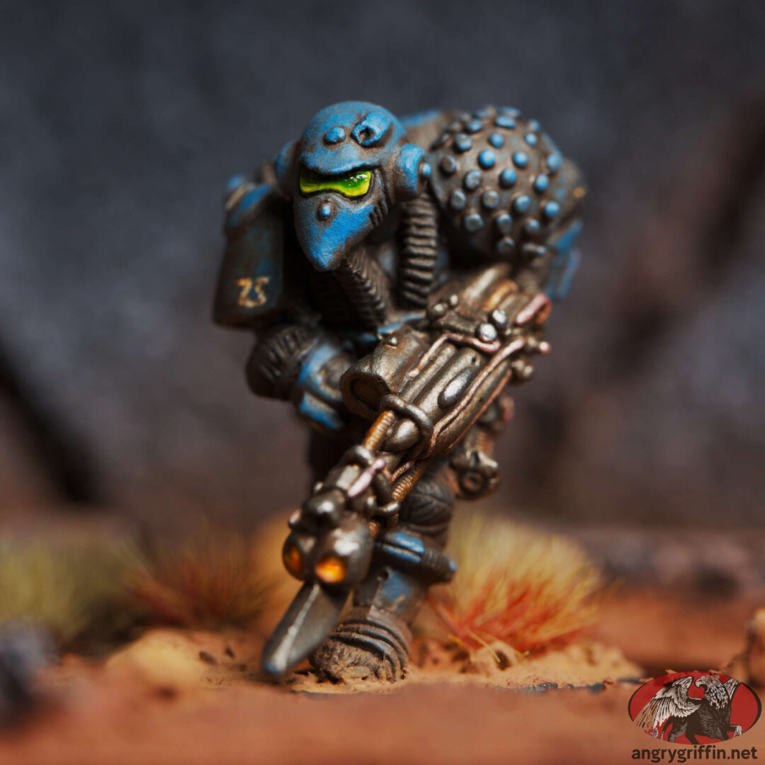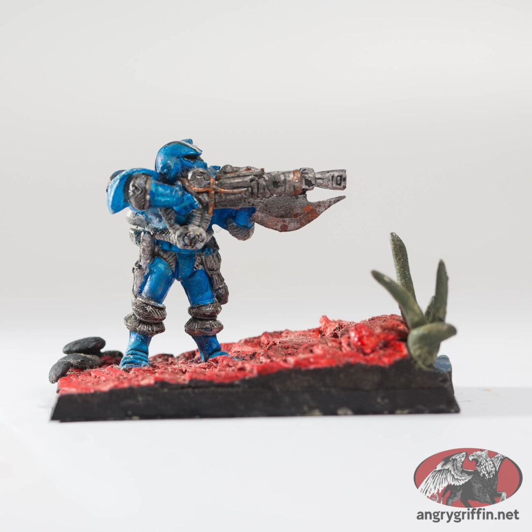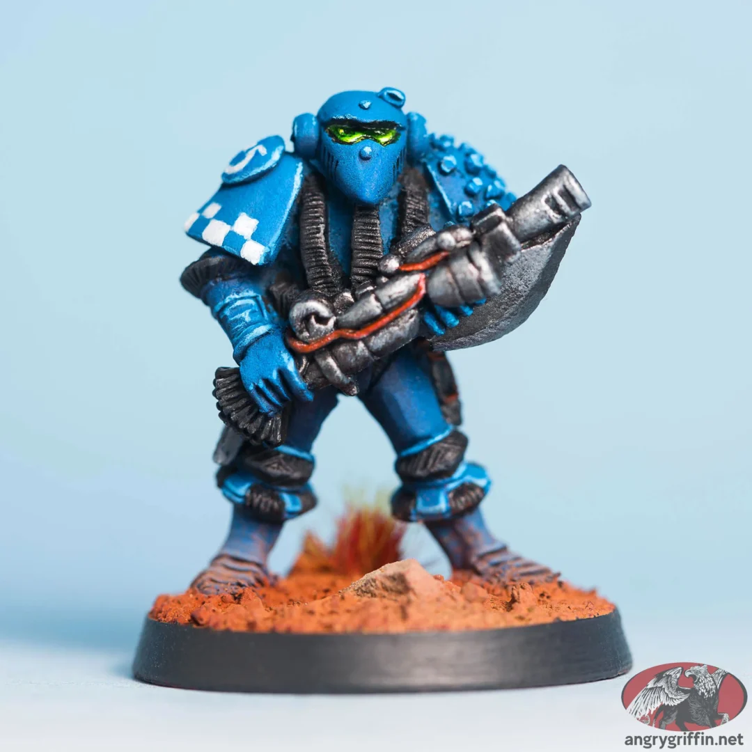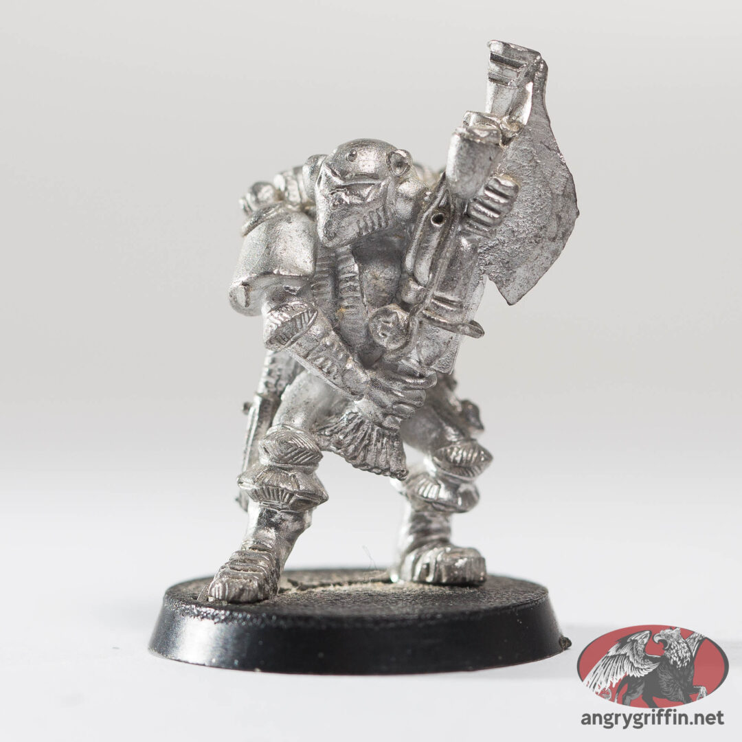 These are the miniatures which were released prior to the first edition of Warhammer 40K which were an influence; obvious candidates include Bob Naismith’s C100 Imperial Space Marines and the Judge Dredd miniatures which Citadel released.