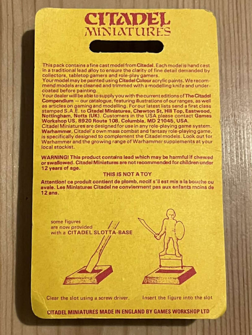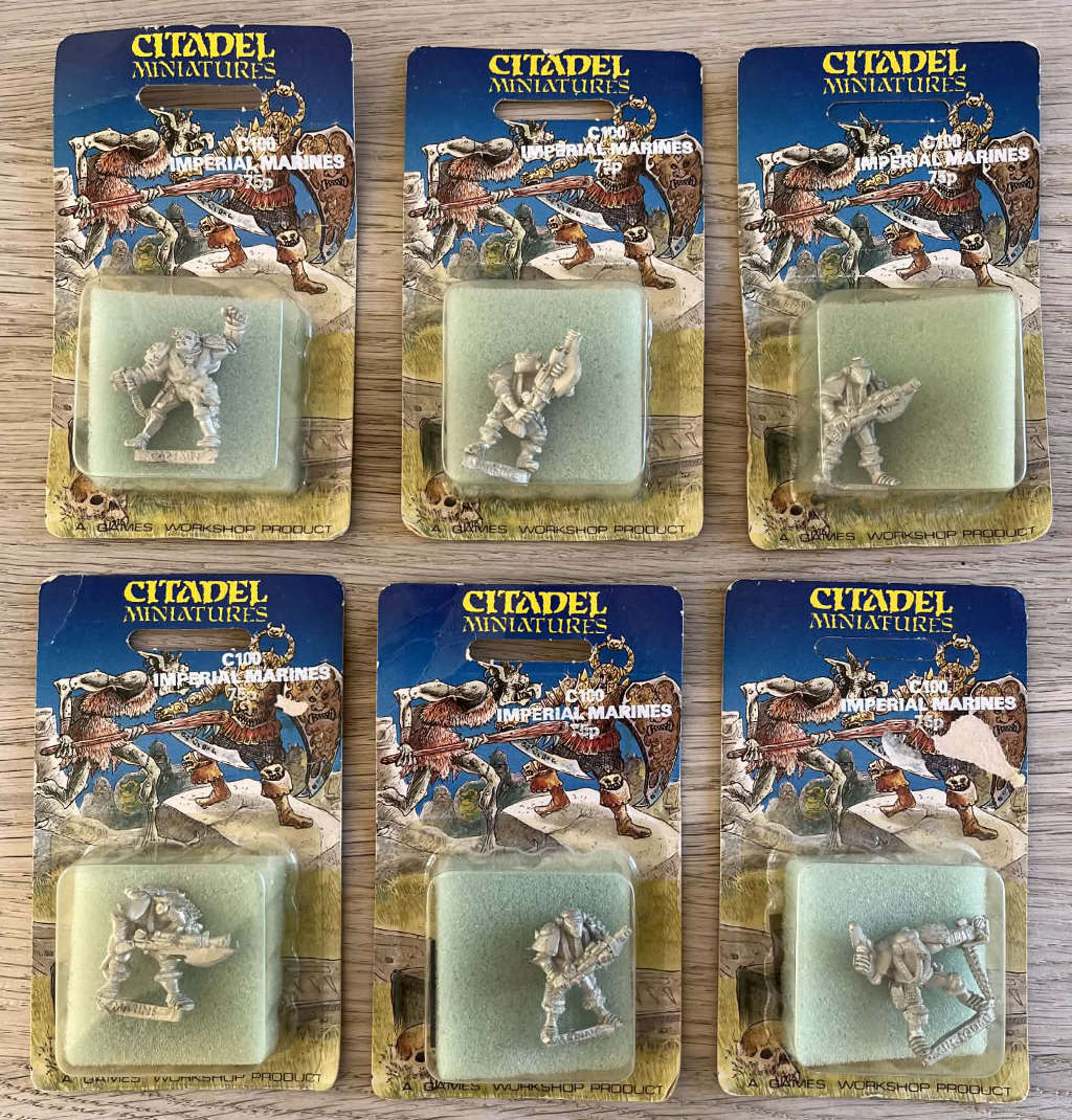 These are the miniatures which were released prior to the first edition of Warhammer 40K which were an influence; obvious candidates include Bob Naismith’s C100 Imperial Space Marines and the Judge Dredd miniatures which Citadel released.