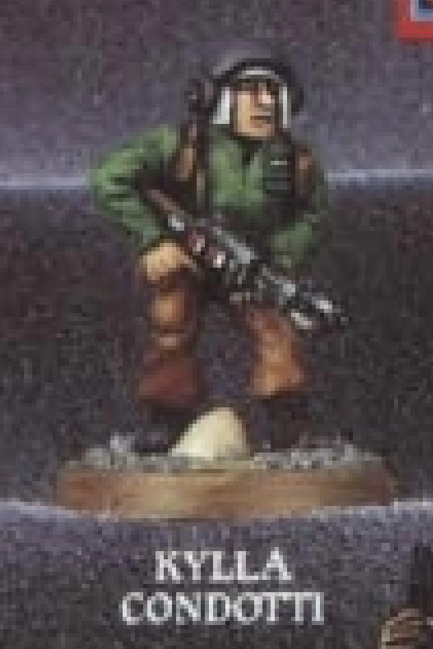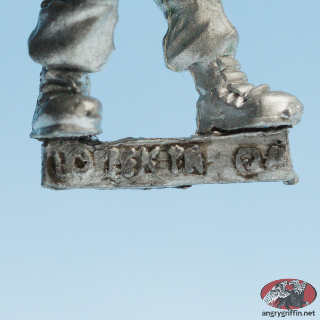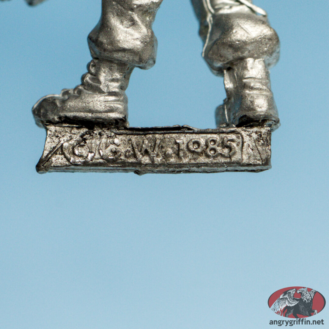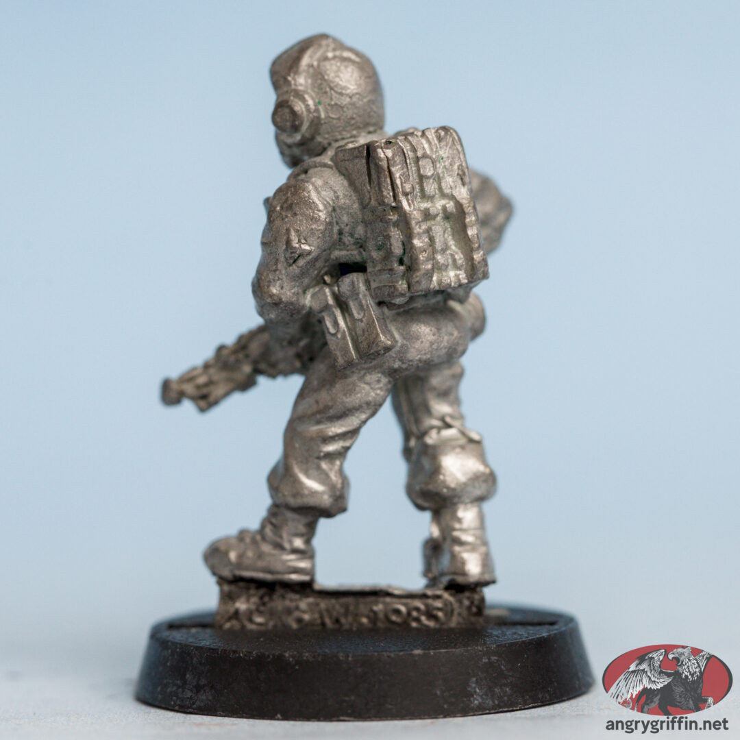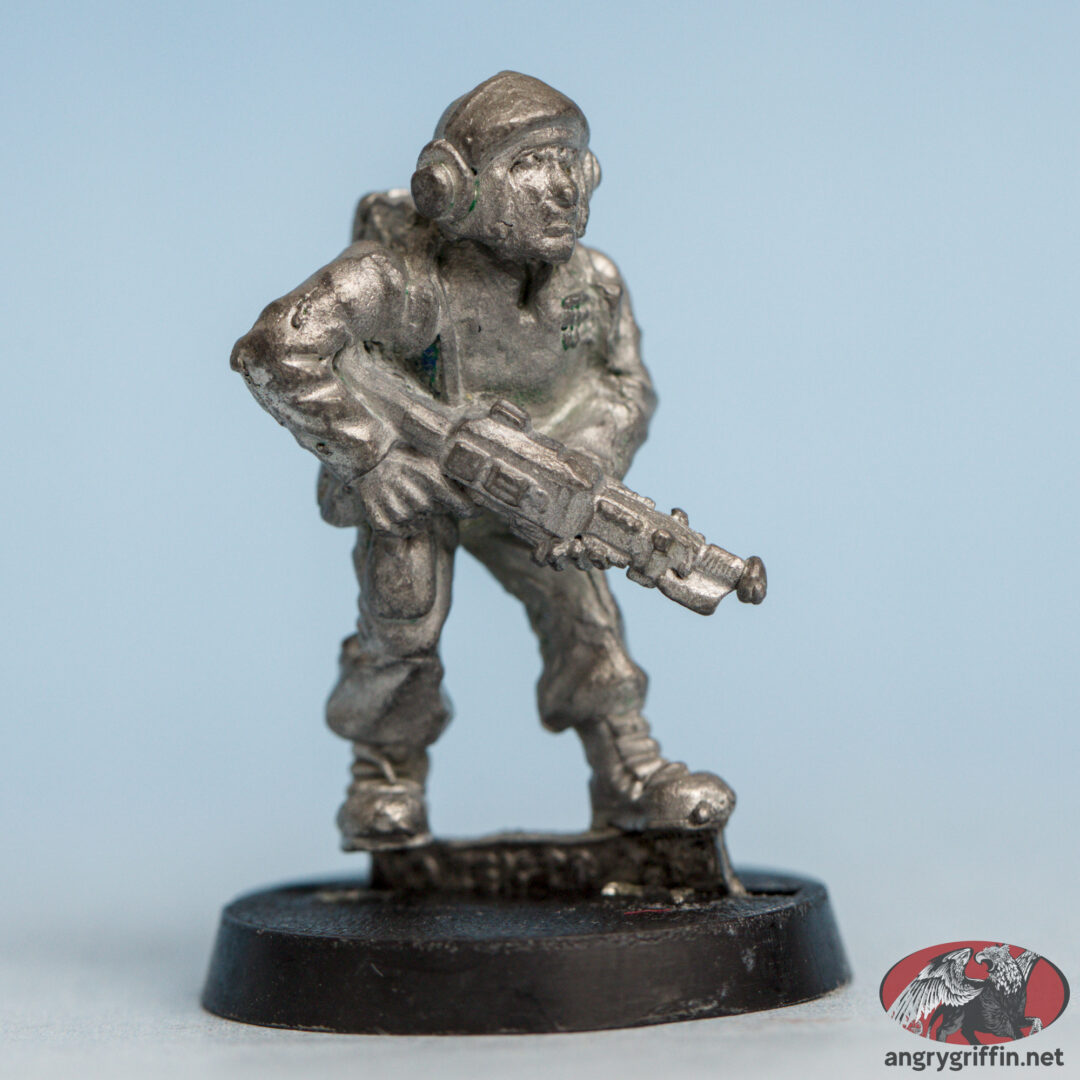 This metal Rogue Trader miniature was first seen as the Imperial Garrison Trooper in the first Rogue Trader releases, and later as the mercenary Kylla Condotti. He’s a 1985 Bob Naismith sculpt.