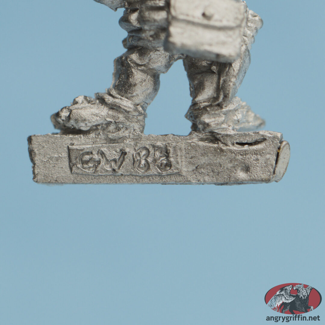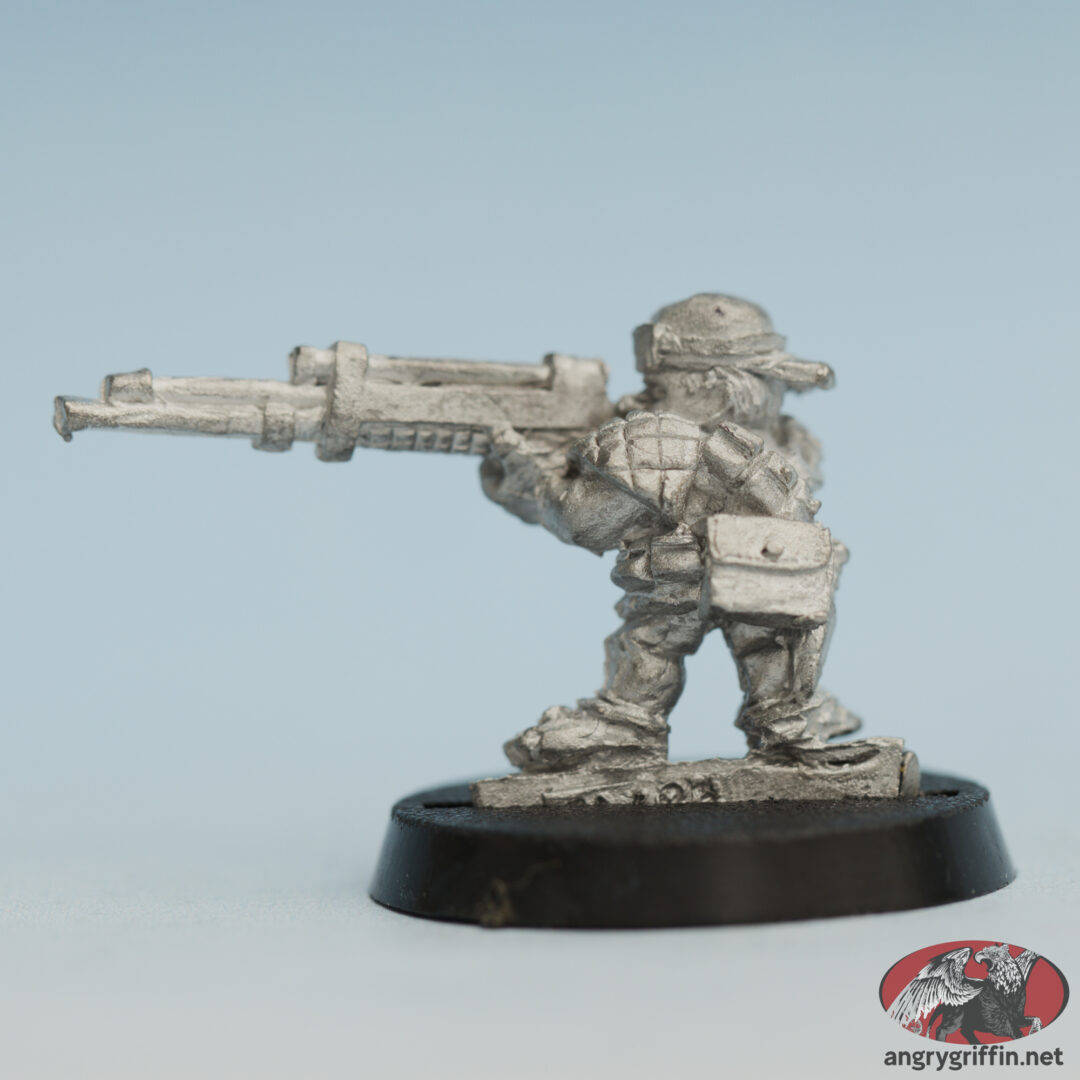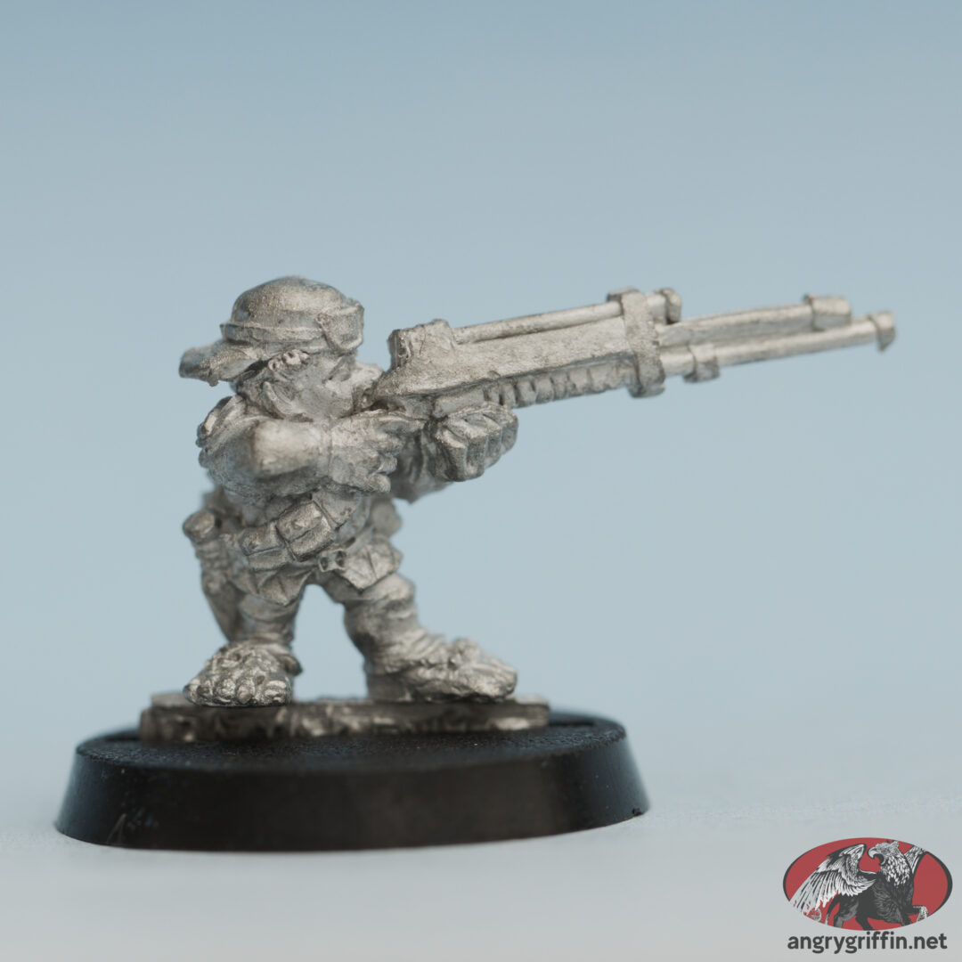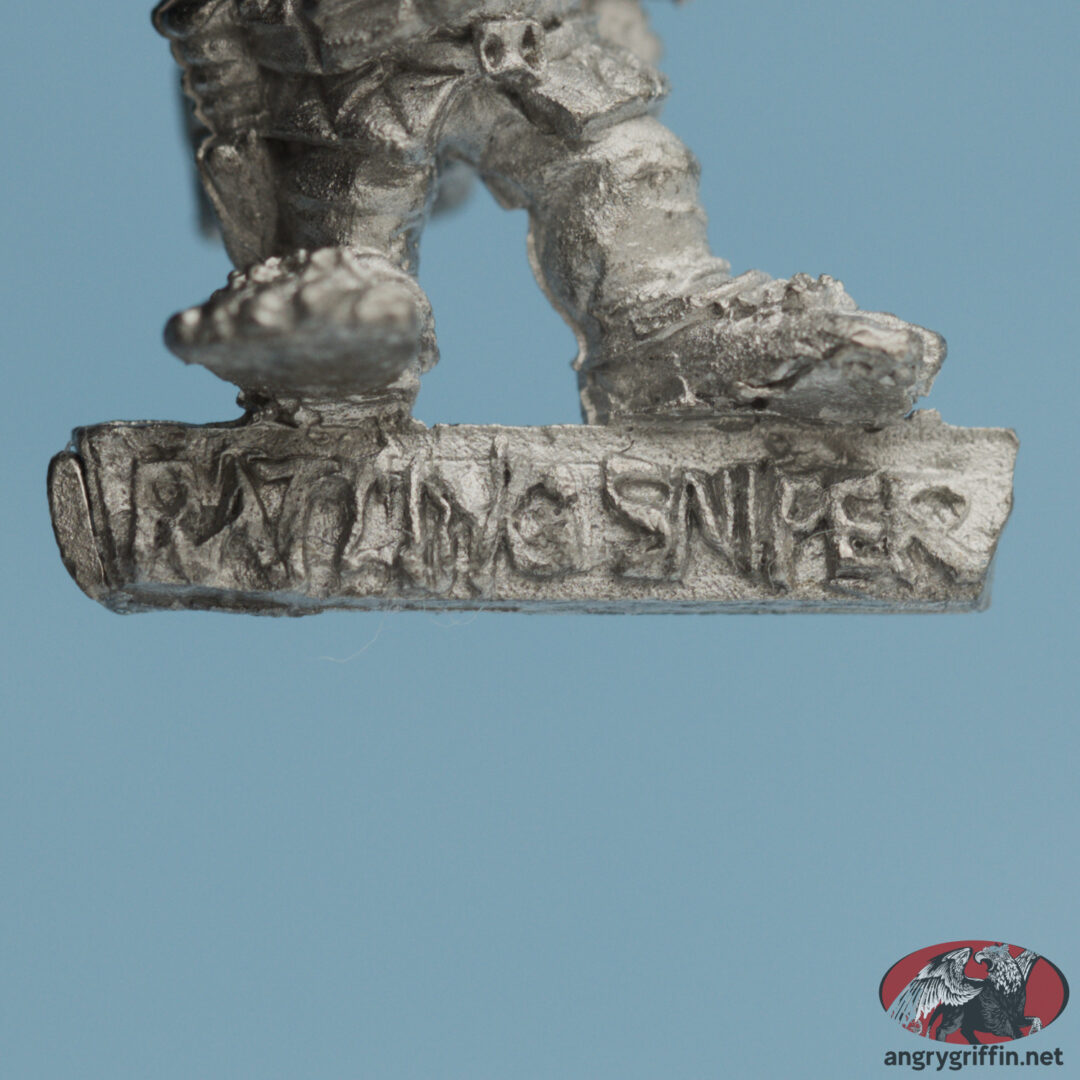 This metal Rogue Trader-era Warhammer 40K miniature was one of the Ratling Snipers shown in the 4011 flyers as 401110, sculpted by Alan Perry.