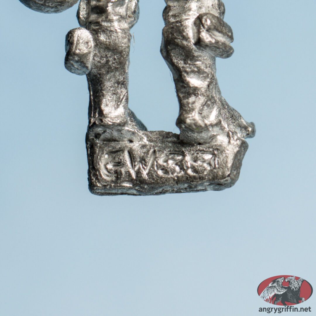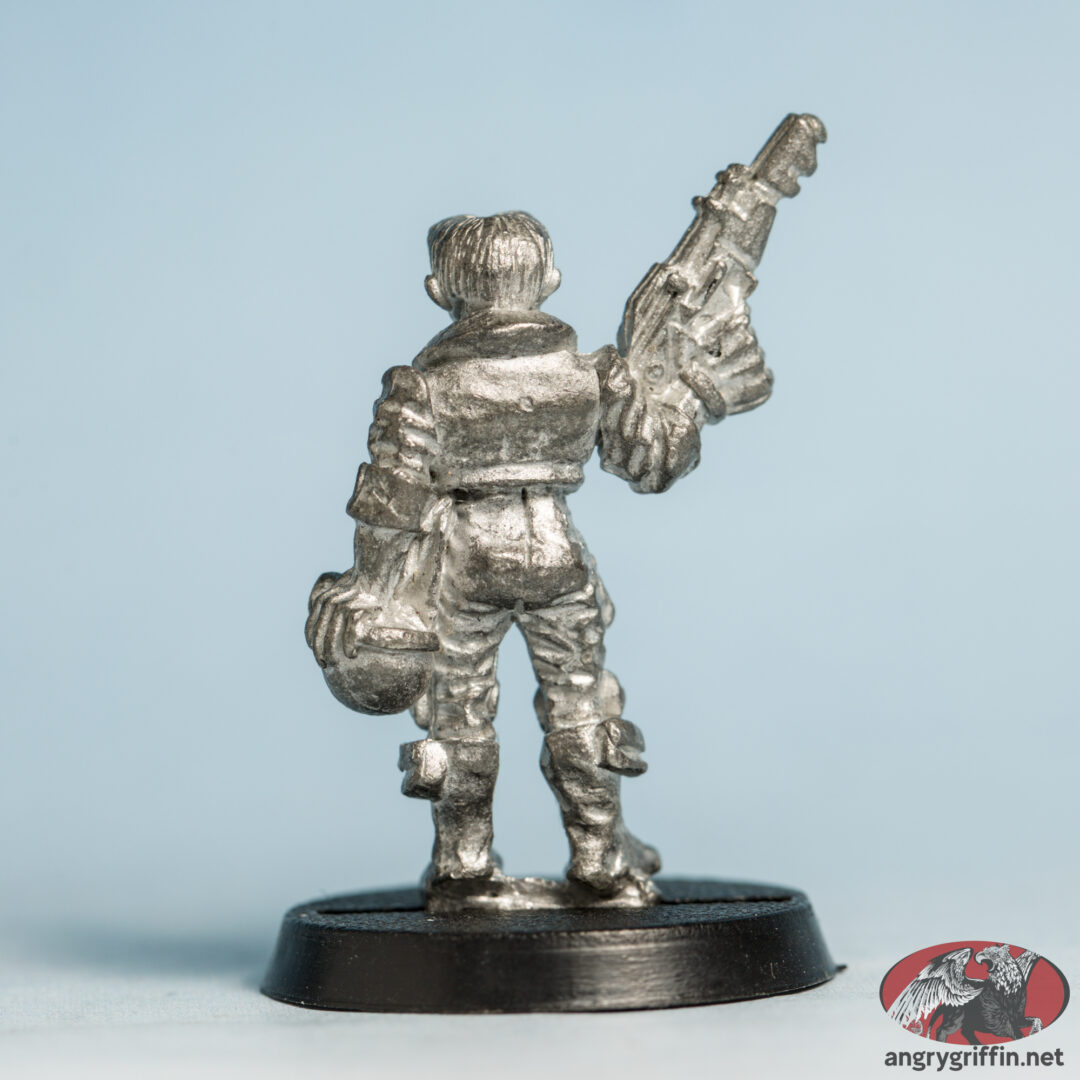 This metal Rogue Trader-era Adventurer was called Pilot Rav. He was a 1988 sculpt as per the tab but I can’t find out who sculpted him.