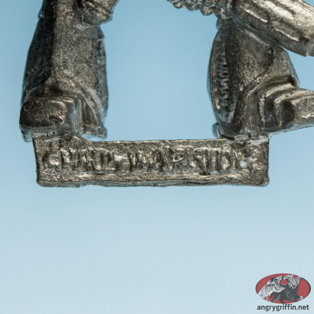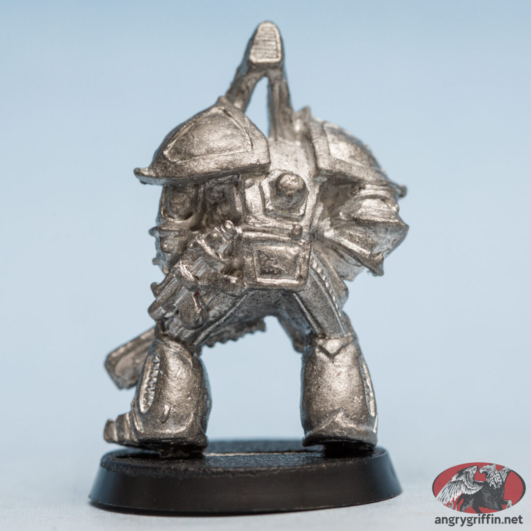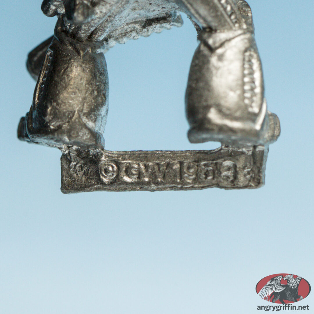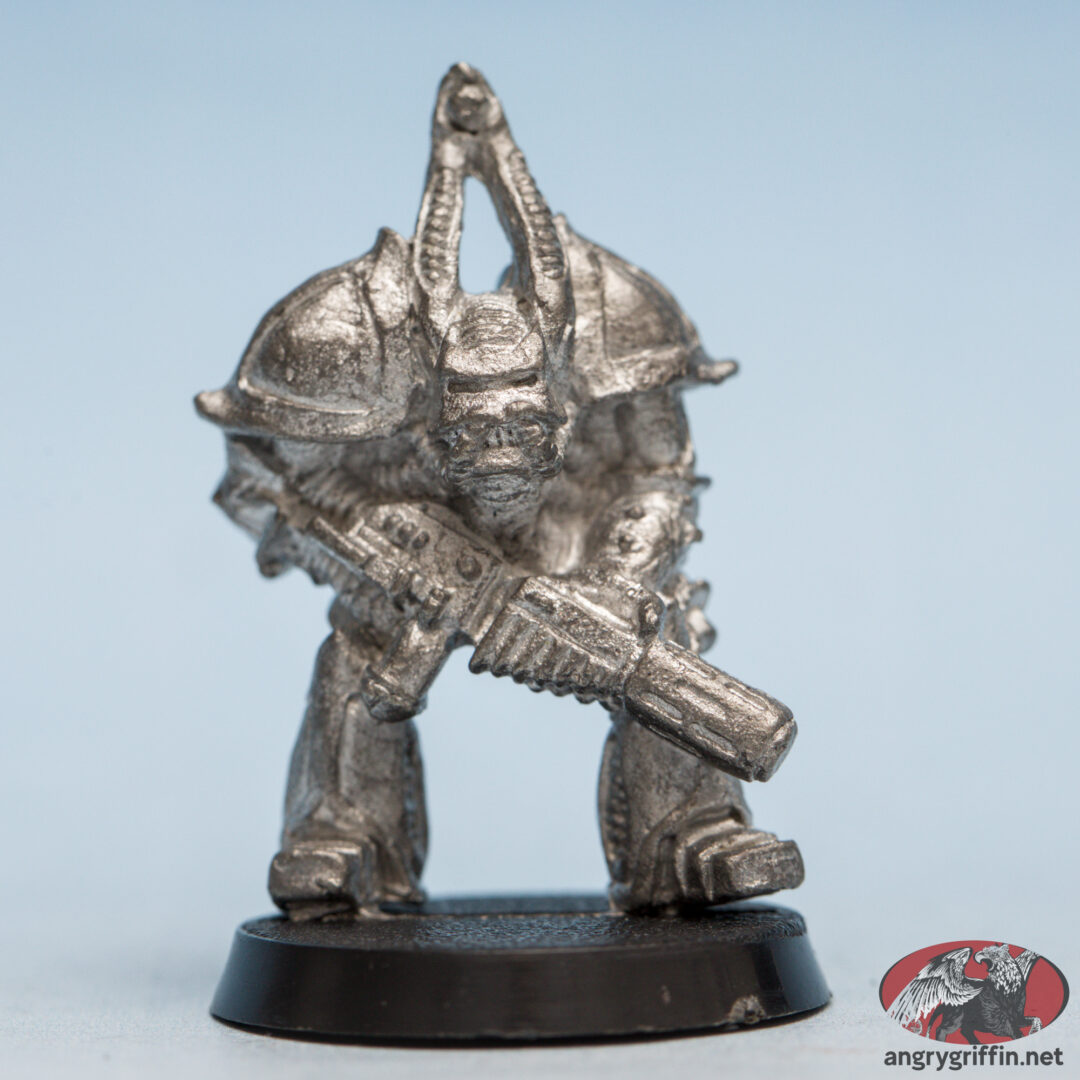 This metal Rogue Trader-era Chaos Space Marine Renegade with Meltagun appeared in the 1991 Blue catalogue as part number 070315/16. Design credit for the page it appears on goes to Michael Perry and Kev Adams, and I don’t know which sculpted this one!