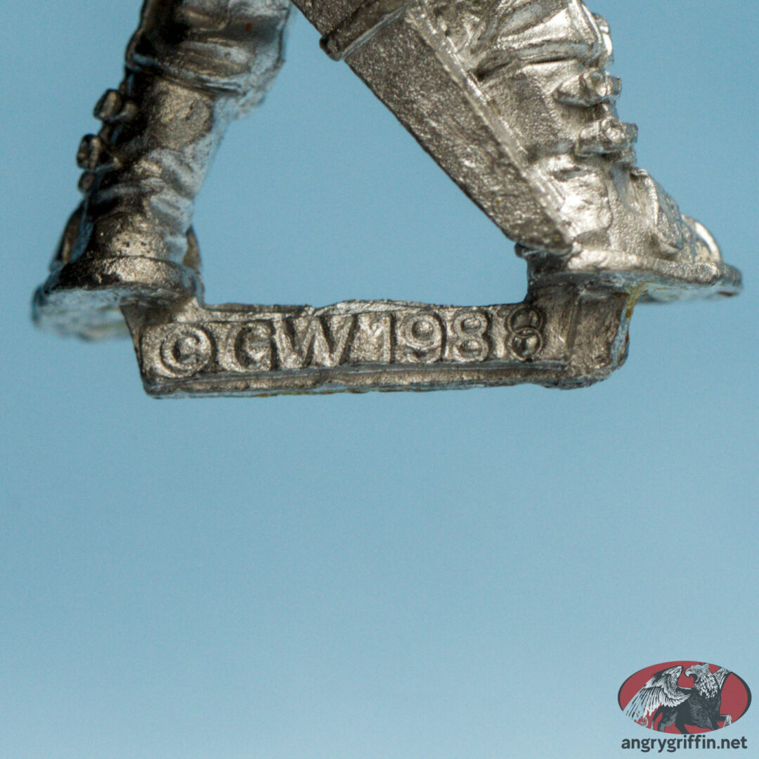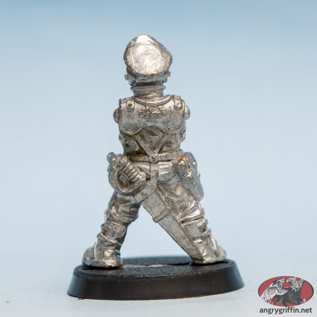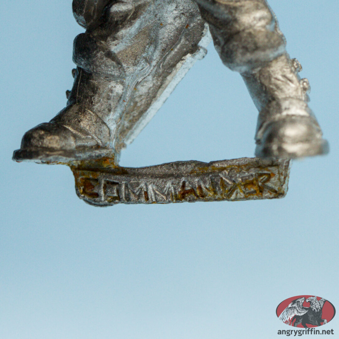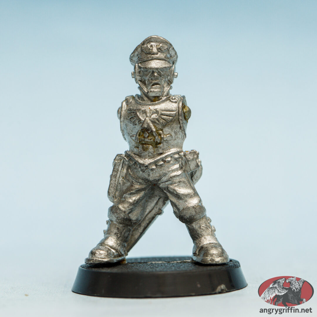 This armless metal Rogue Trader Imperial Army Commander was a 1988 sculpt. White Dwarf #110 gives sculpting credit to Mark Copplestone.