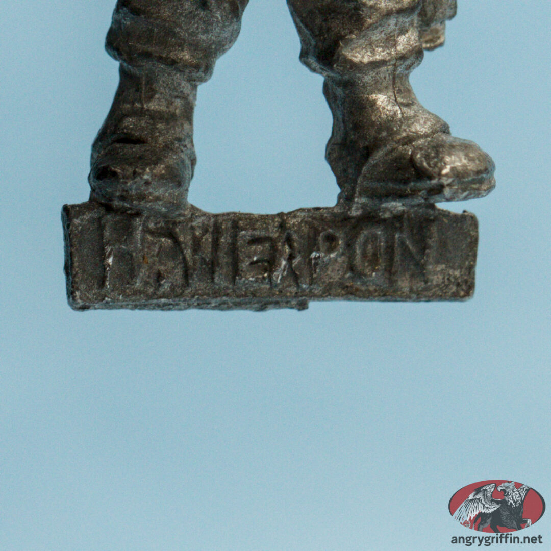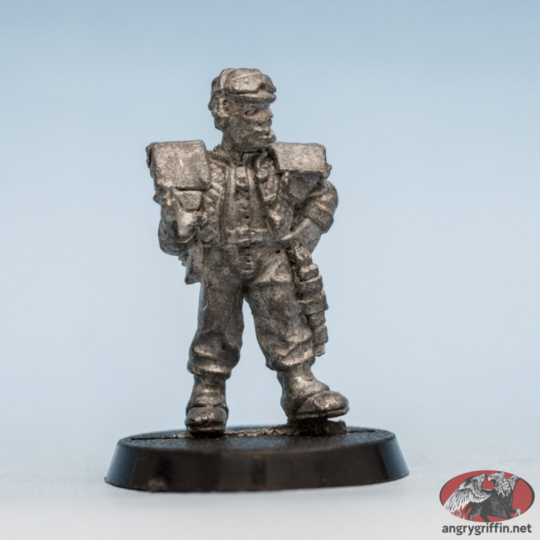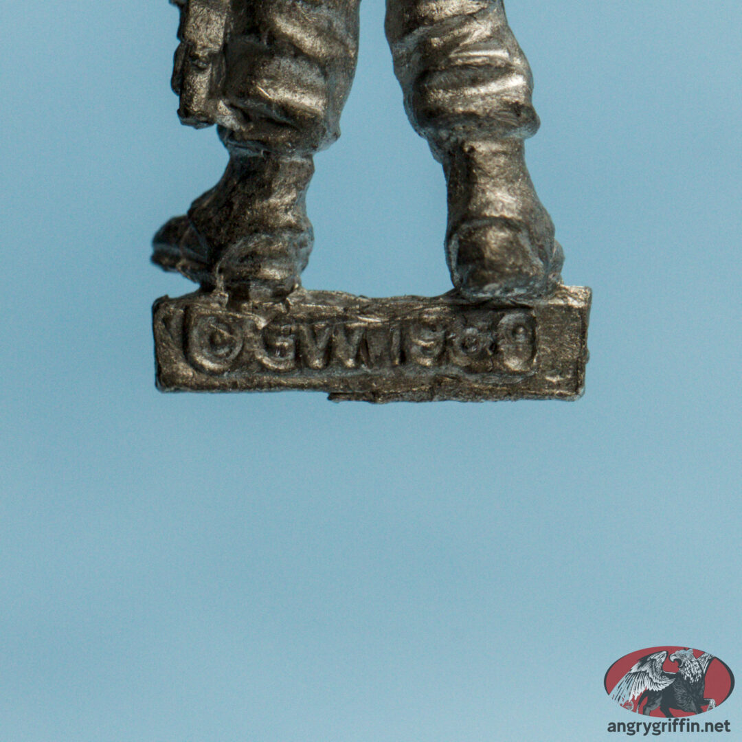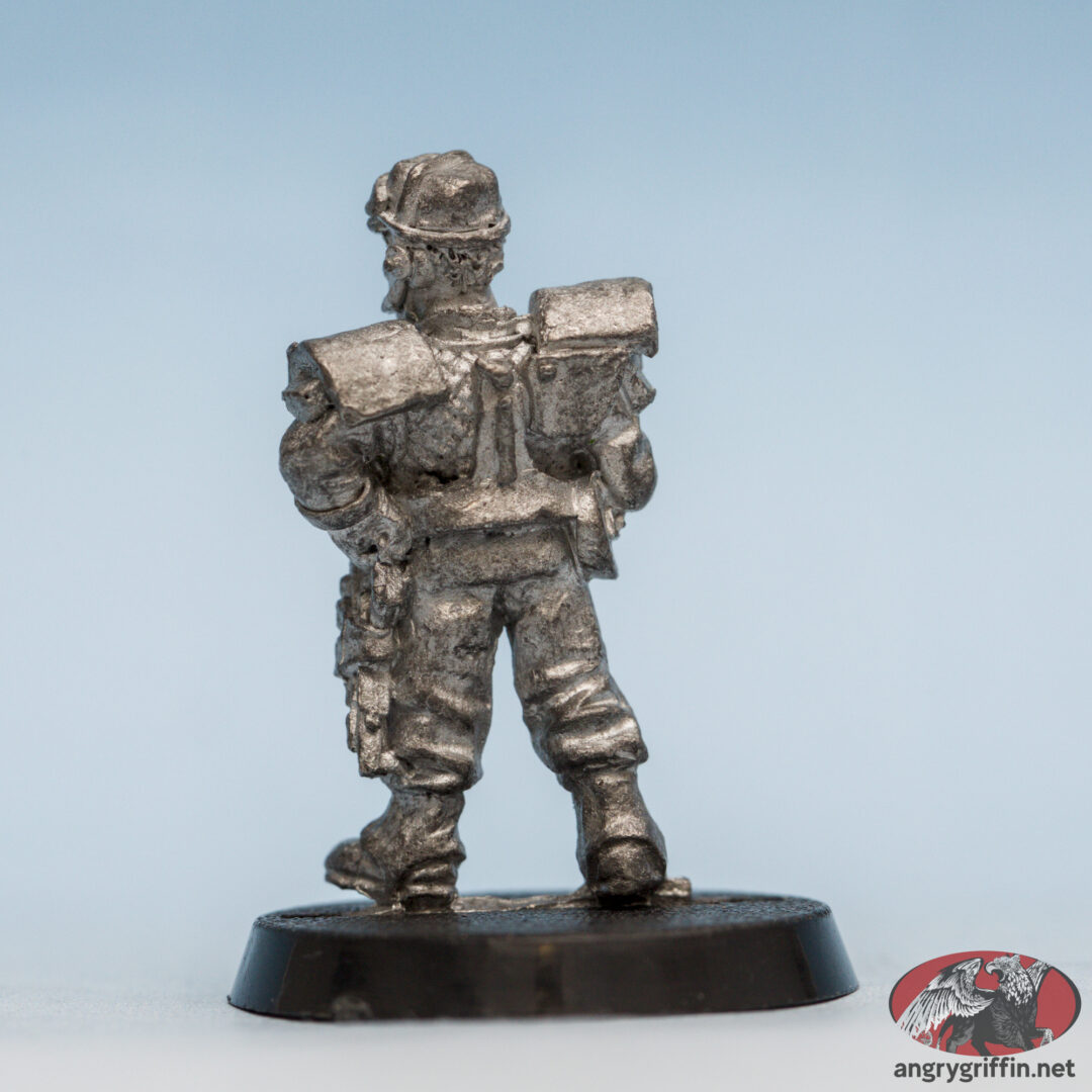 This metal miniature is from the Rogue Trader era of Warhammer 40K and belongs to the Imperial Army. He’s one of the heavy weapons troopers. I can’t find a sculpting credit for him, but his sculpting date is 1988 according to the tab.