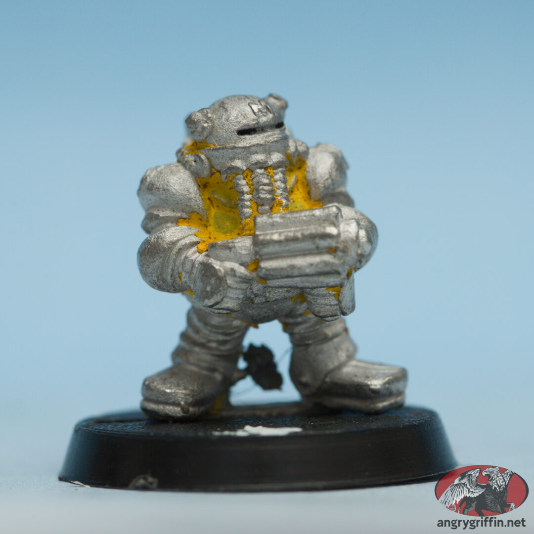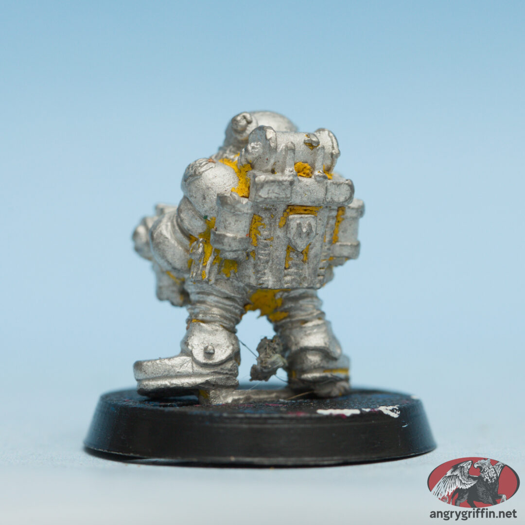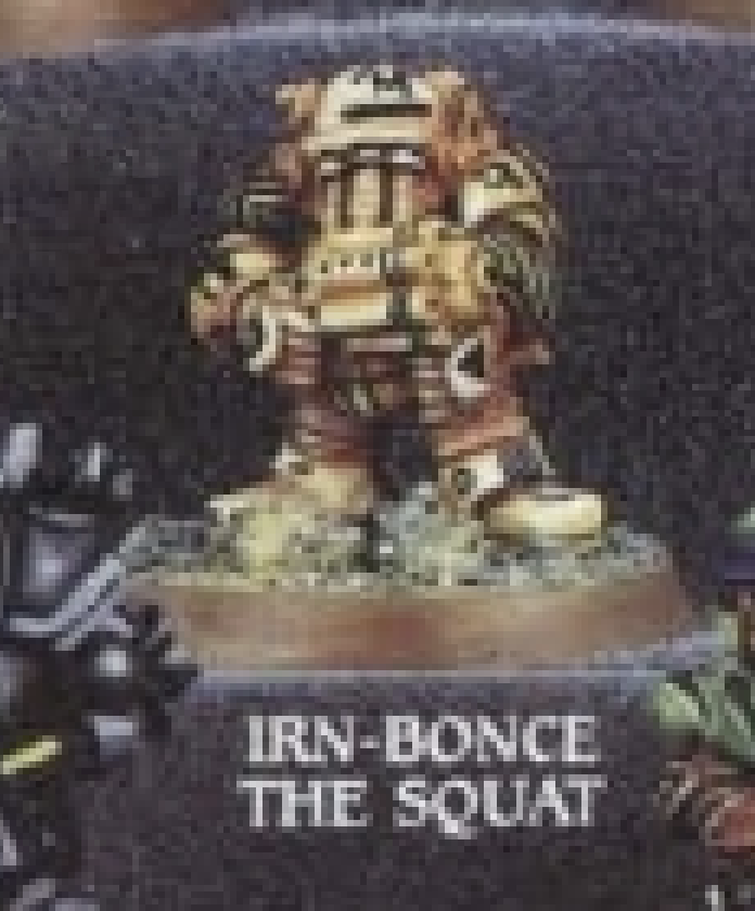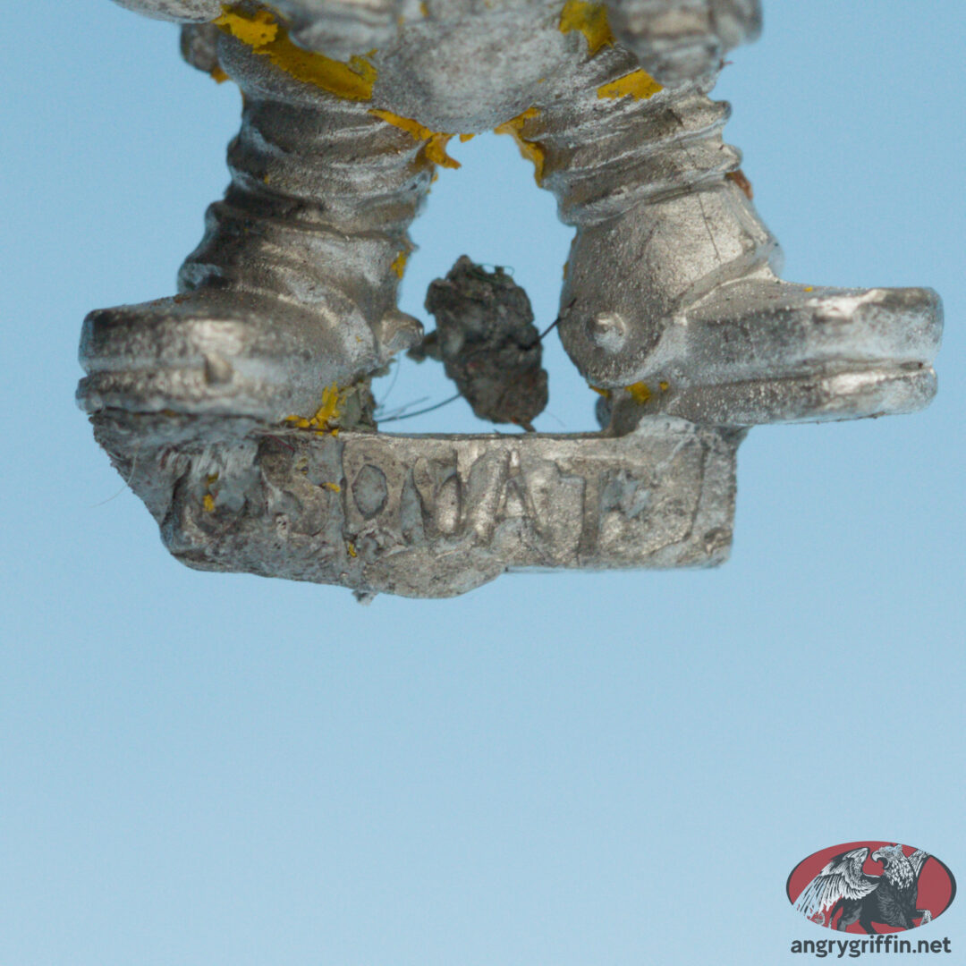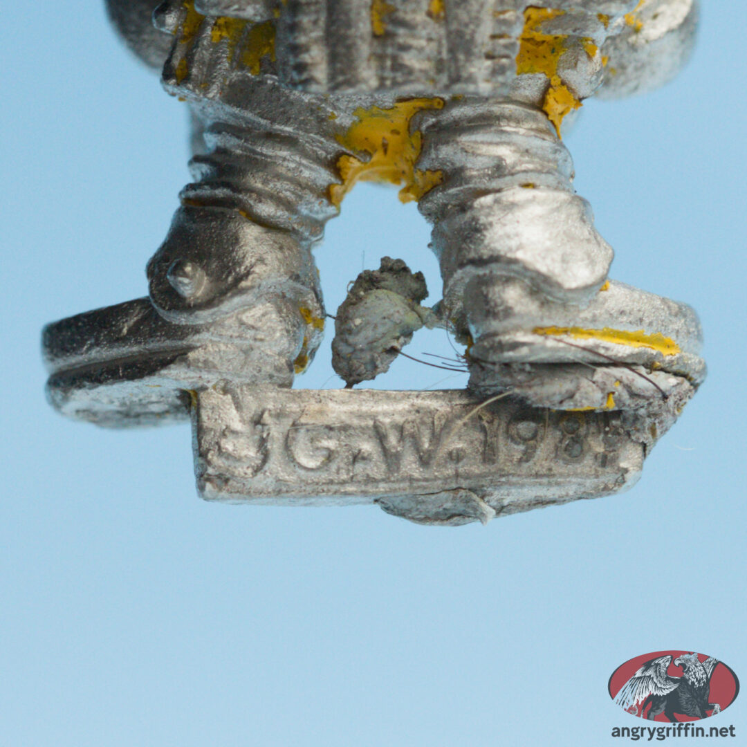 This metal Rogue Trader era Mercenary miniature went by “Irn-Bonce The Squat”. He was also seen in the first Rogue Trader released models as “Space Dwarf”. I need to double check the date on the tab as I can’t make it out in the pic.