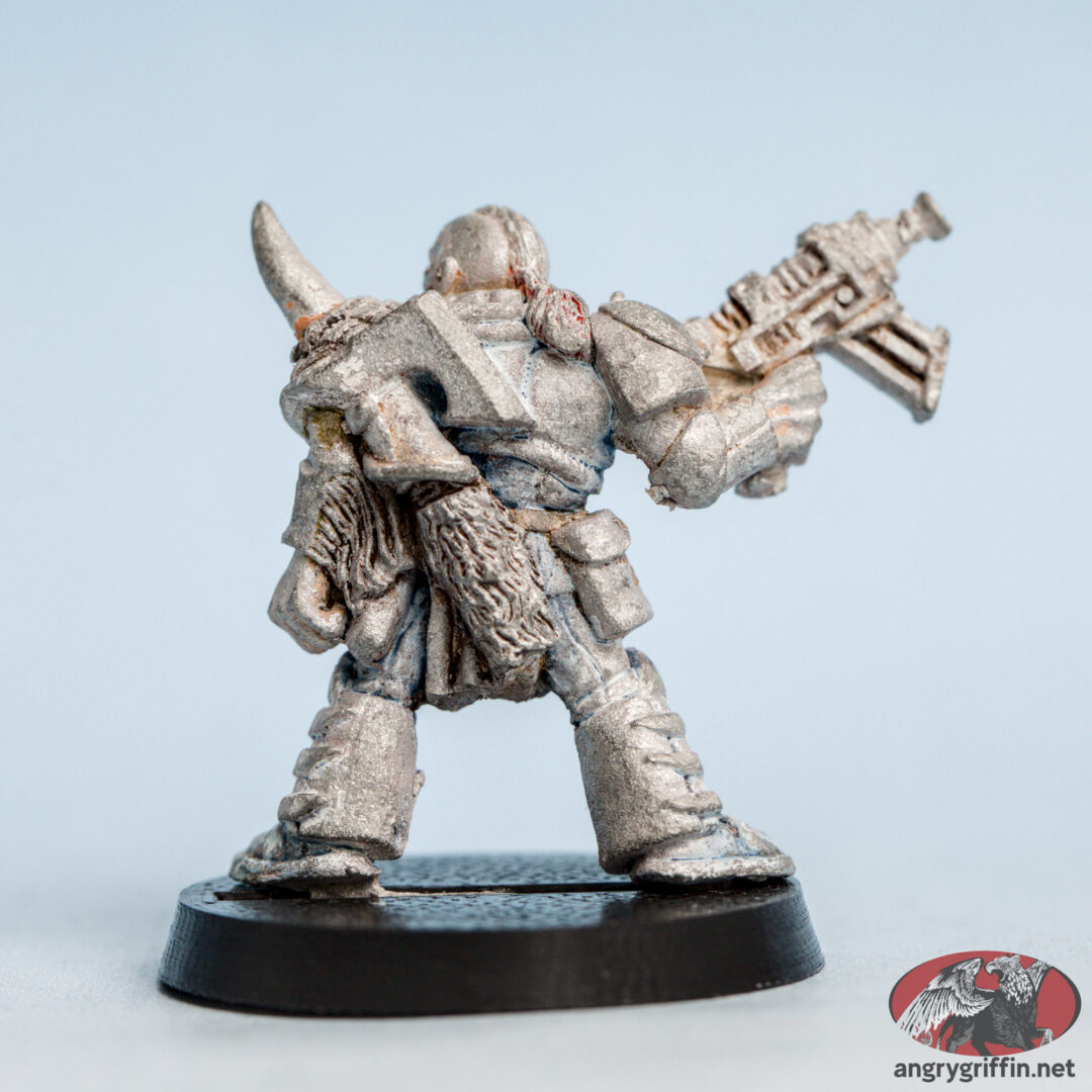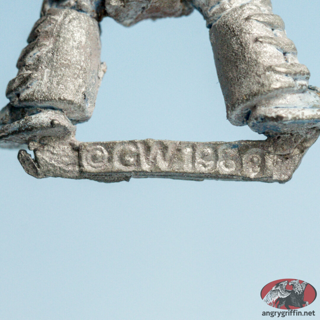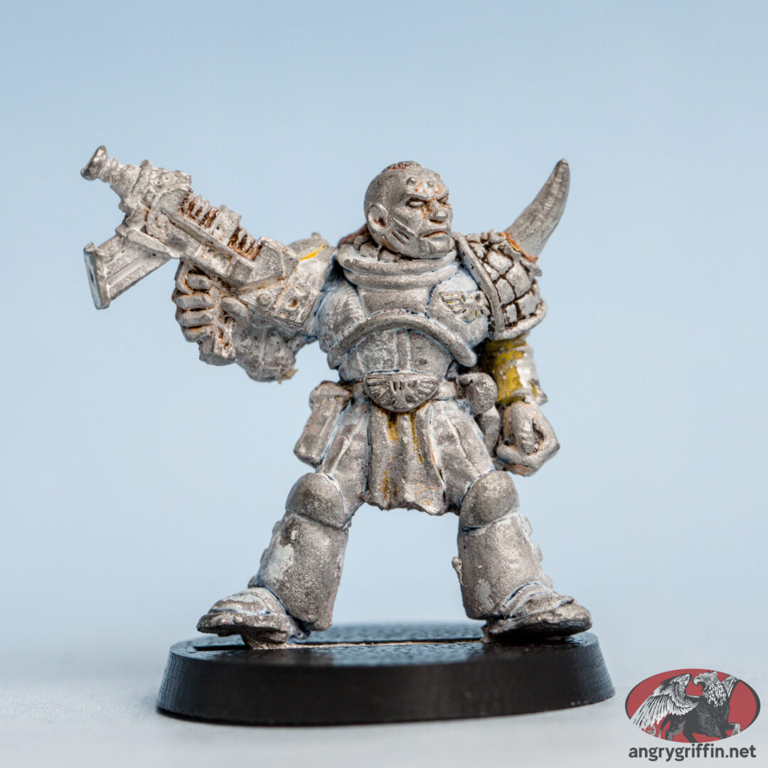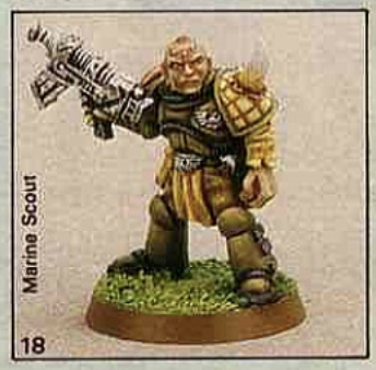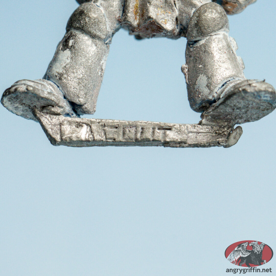 This metal Rogue Trader-era Space Marine Scout with Bolter and Horned Shoulder Pad was a Mark Copplestone sculpt from 1988.