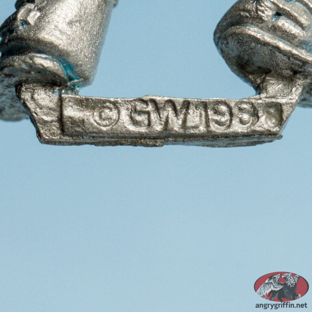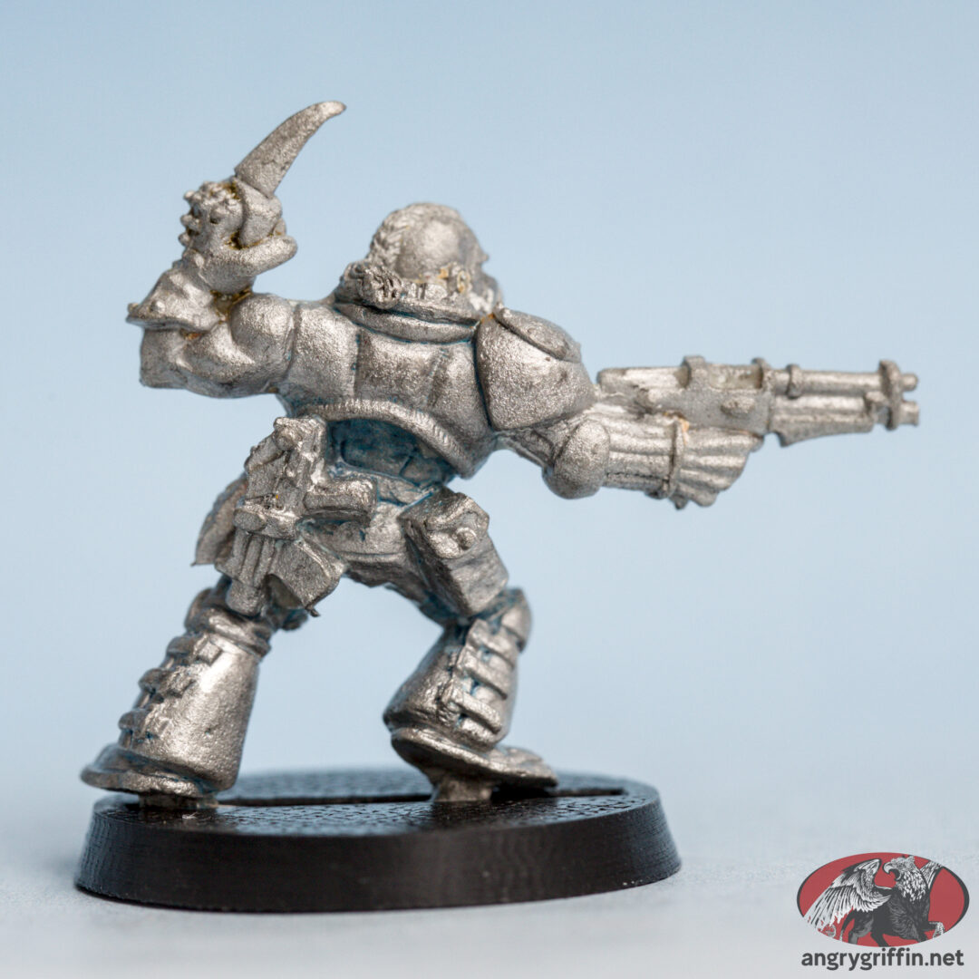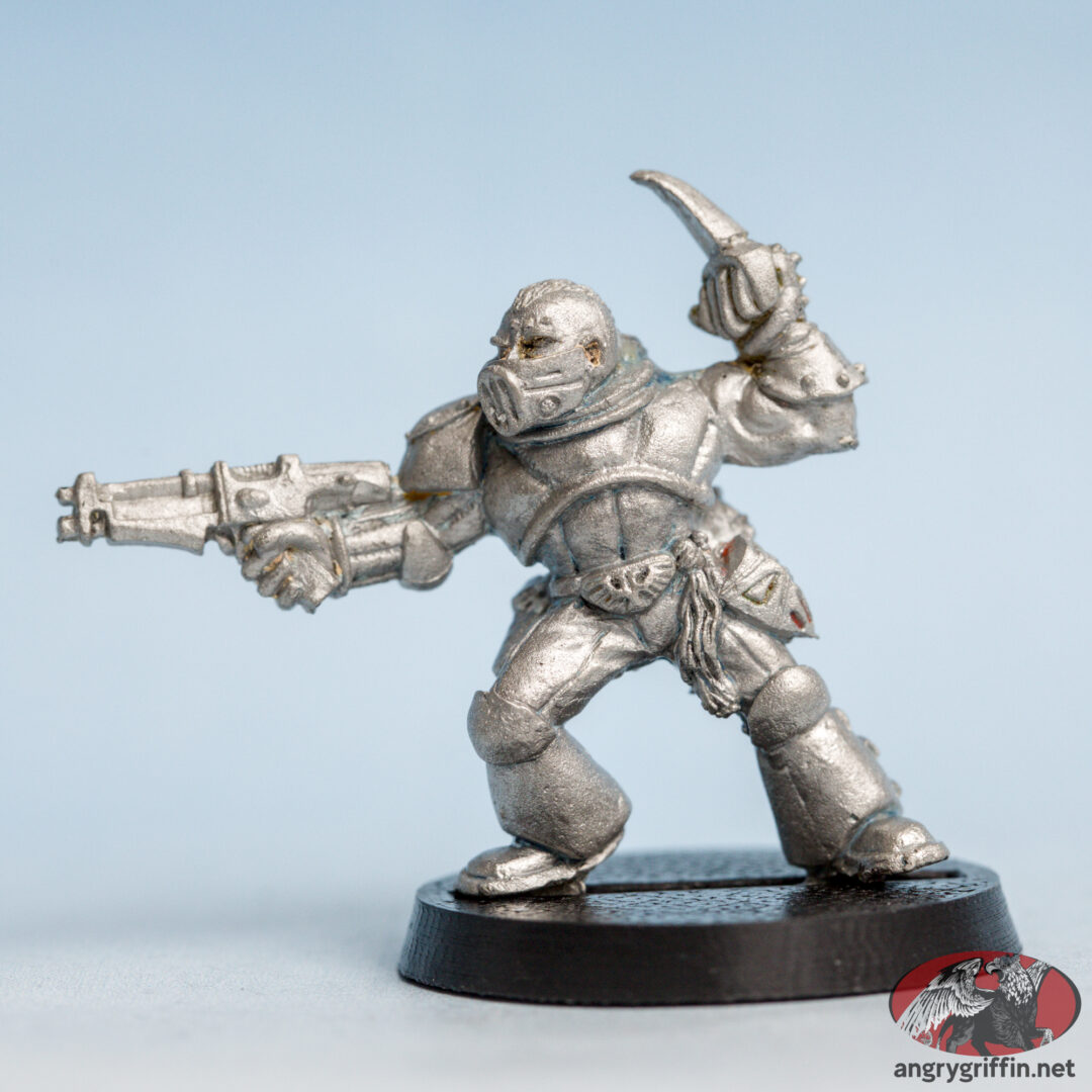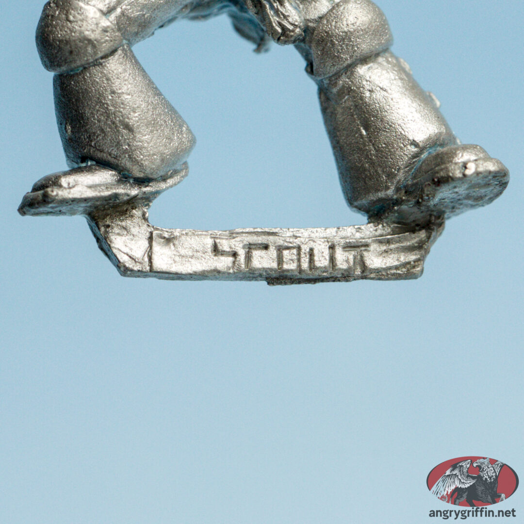 This metal Rogue Trader-era Space Marine Scout with Punch Dagger is a 1988 Mark Copplestone sculpt. He appears in the 1991 Blue catalogue as part number 070295/6.