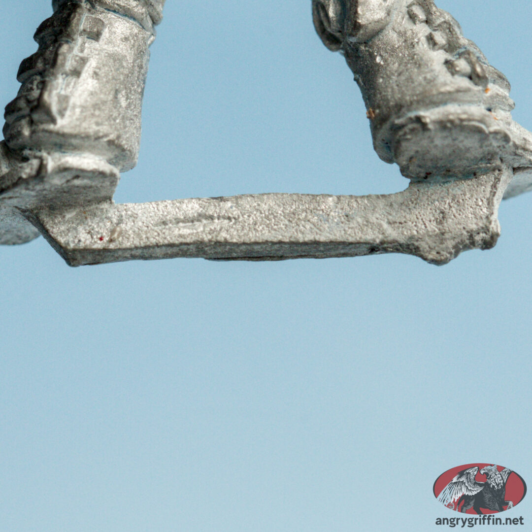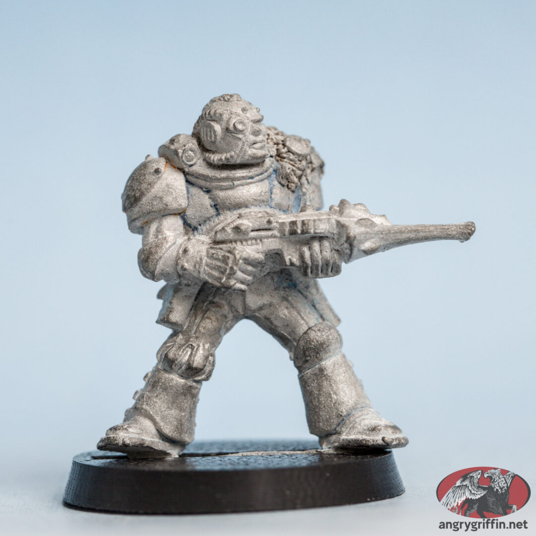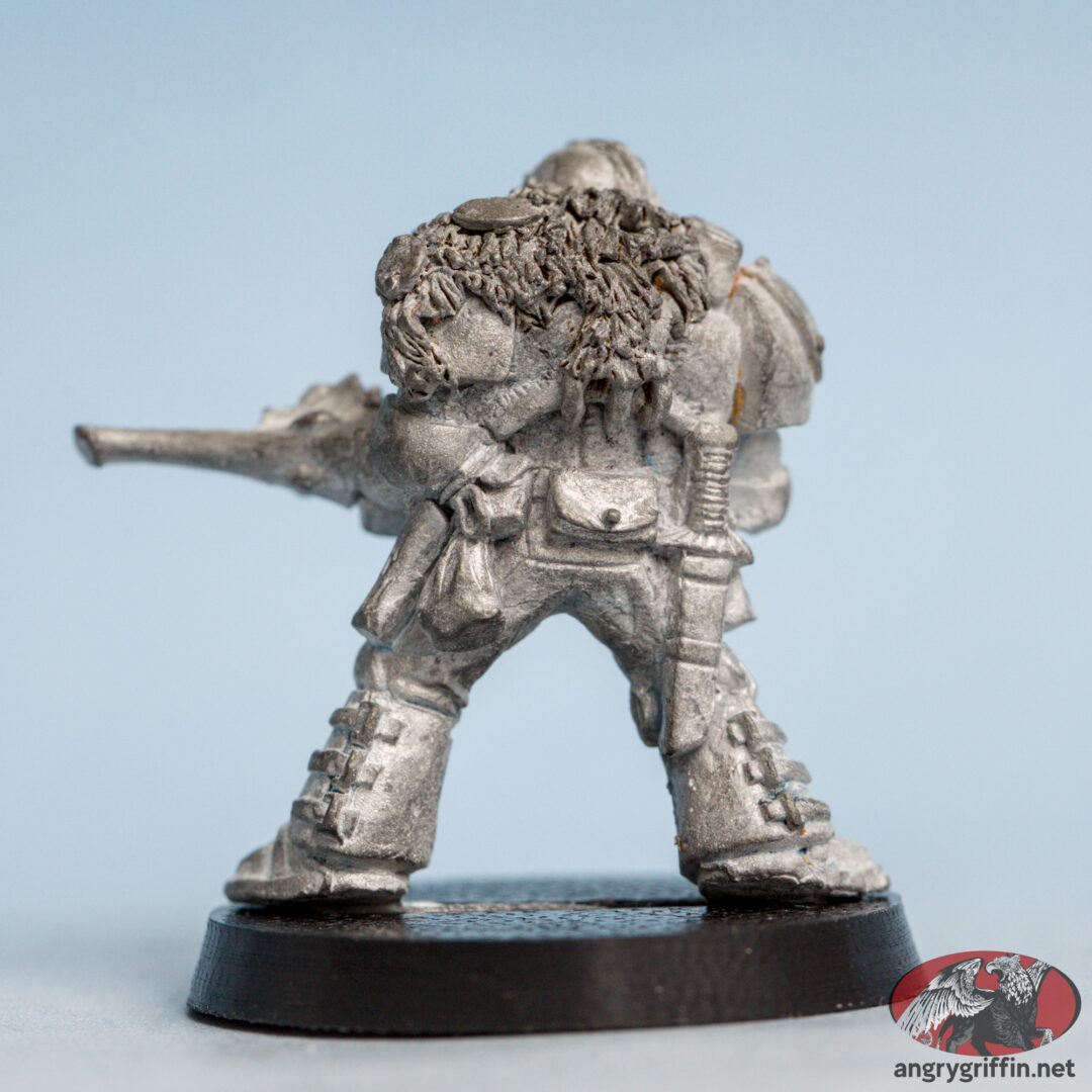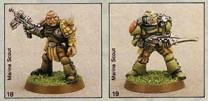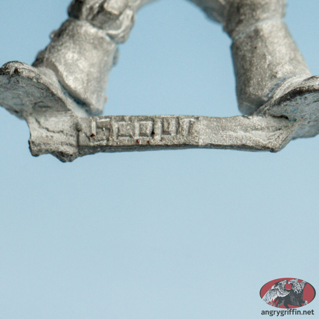 This metal Rogue Trader-era Space Marine Scout carried a Shuriken catapult (rather unusually, by modern standards) and was sculpted by Mark Copplestone. He’s seen in the 1991 Blue catalogue as part number 070295/4.