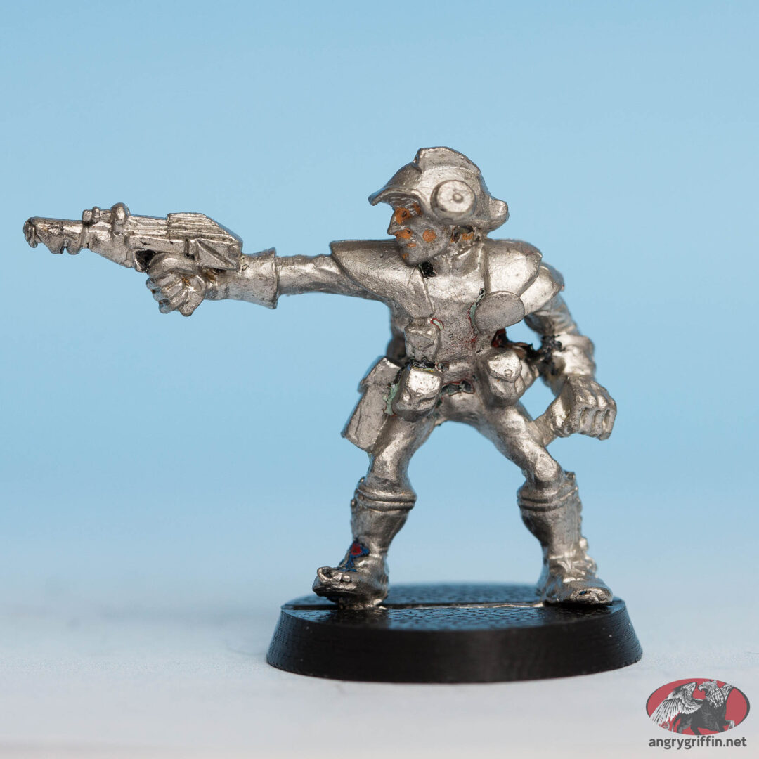 This 1987 Aly Morrison sculpt (someone had been watching Alien… Trooper Vaskez also features in this range) is for the Imperial Army in the Rogue Trader era.