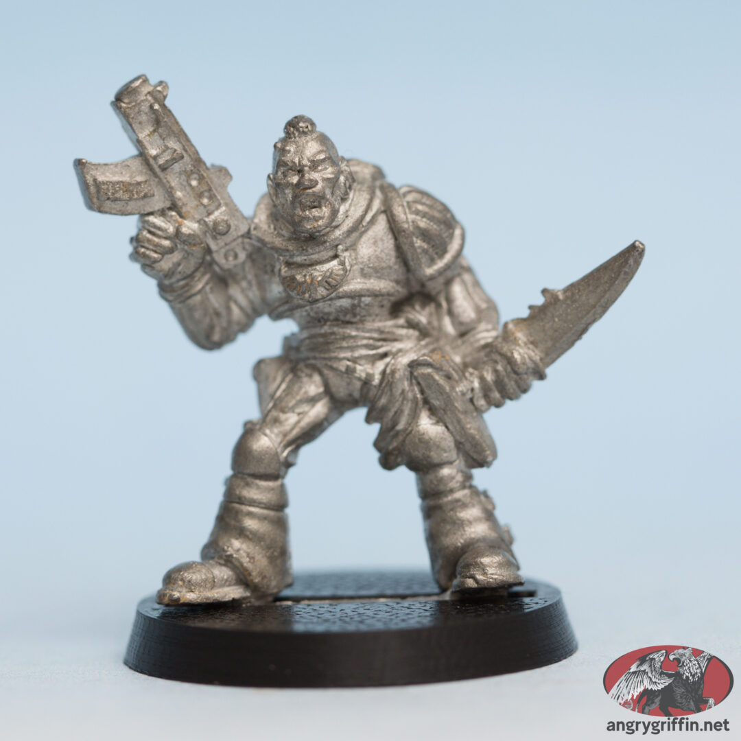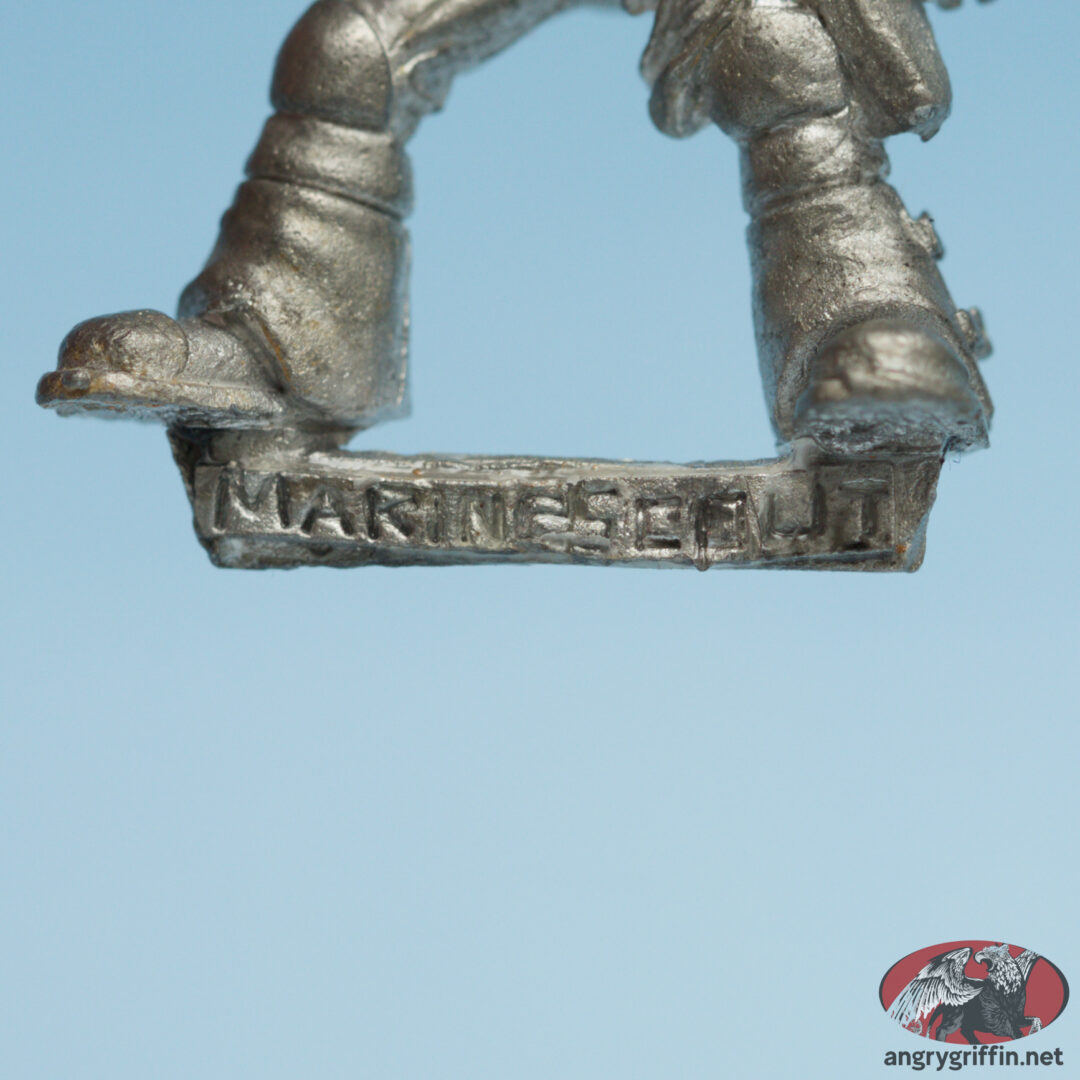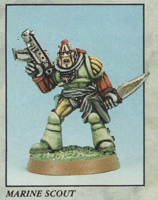 This metal Rogue Trader-era Space Marine Scout with Bolt Pistol and Combat Knife went by part number 070295/12 in the 1991 Blue catalogue.