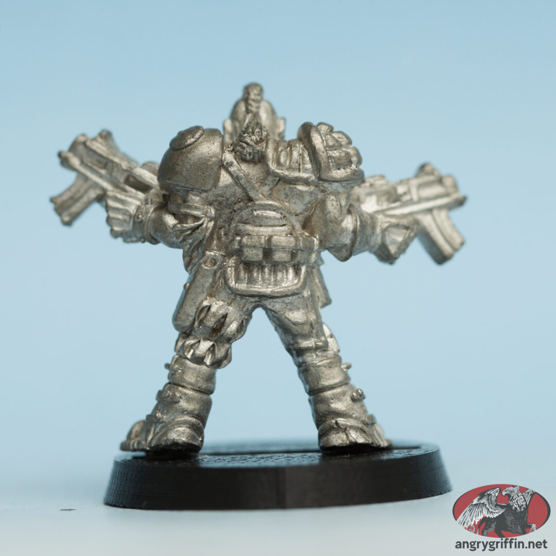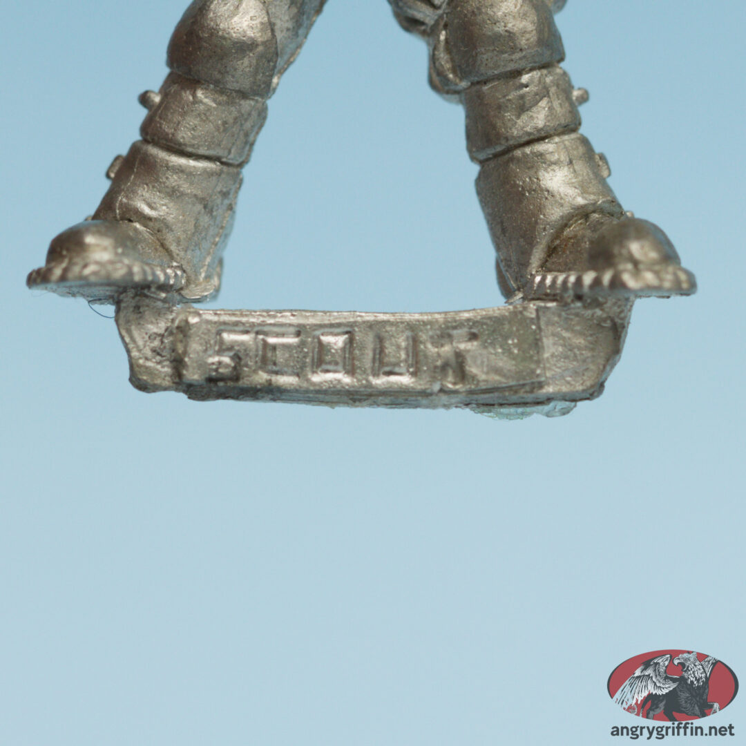This metal Rogue Trader-era Space Marine Scout has no year on the back of the tab, unfortunately. He appears in the 1991 catalogue as part number 070295/9.