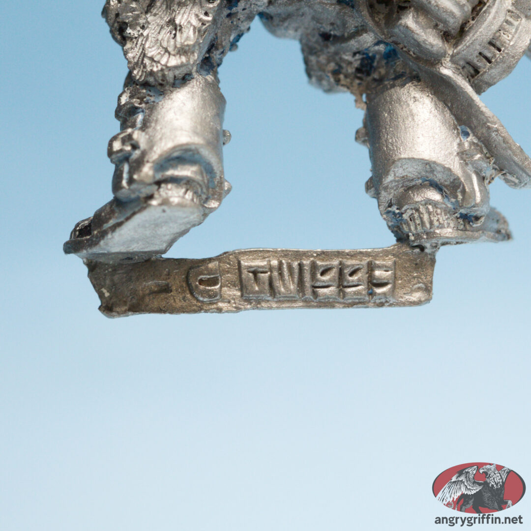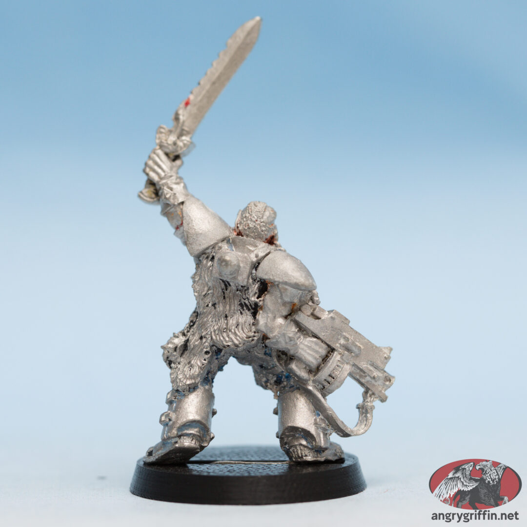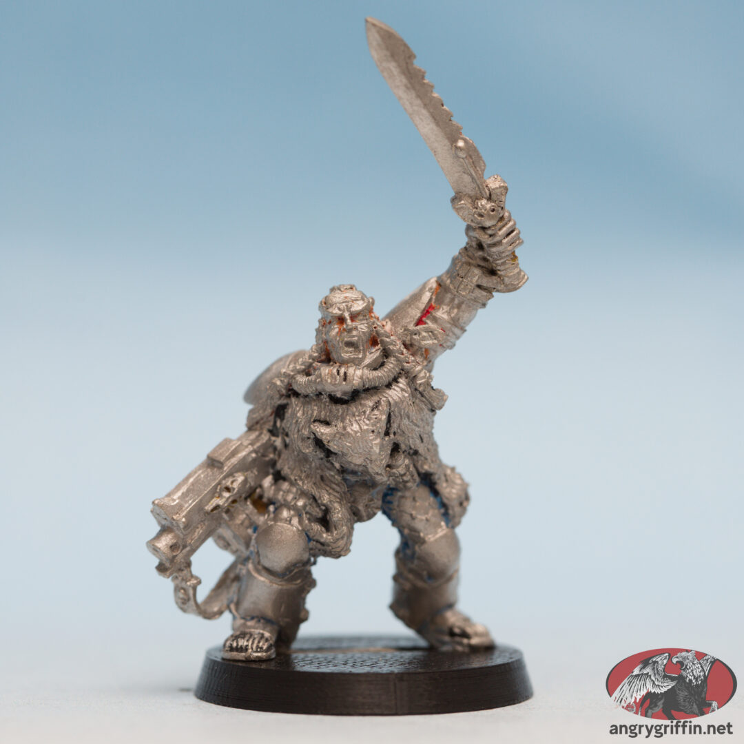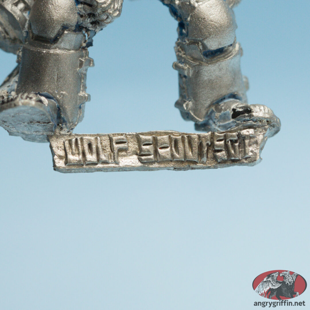 This metal miniature is a 1993 Jes Goodwin sculpt, and goes by Wolf Scout Sergeant 2. He’s part number 70005/2 in the 1994 catalogue.