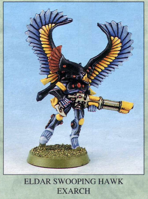 This Eldar Swooping Hawk Exarch with Lasblaster is a 1990 Jes Goodwin sculpt and appears in the 1991 Blue catalogue as part number 071572/5.