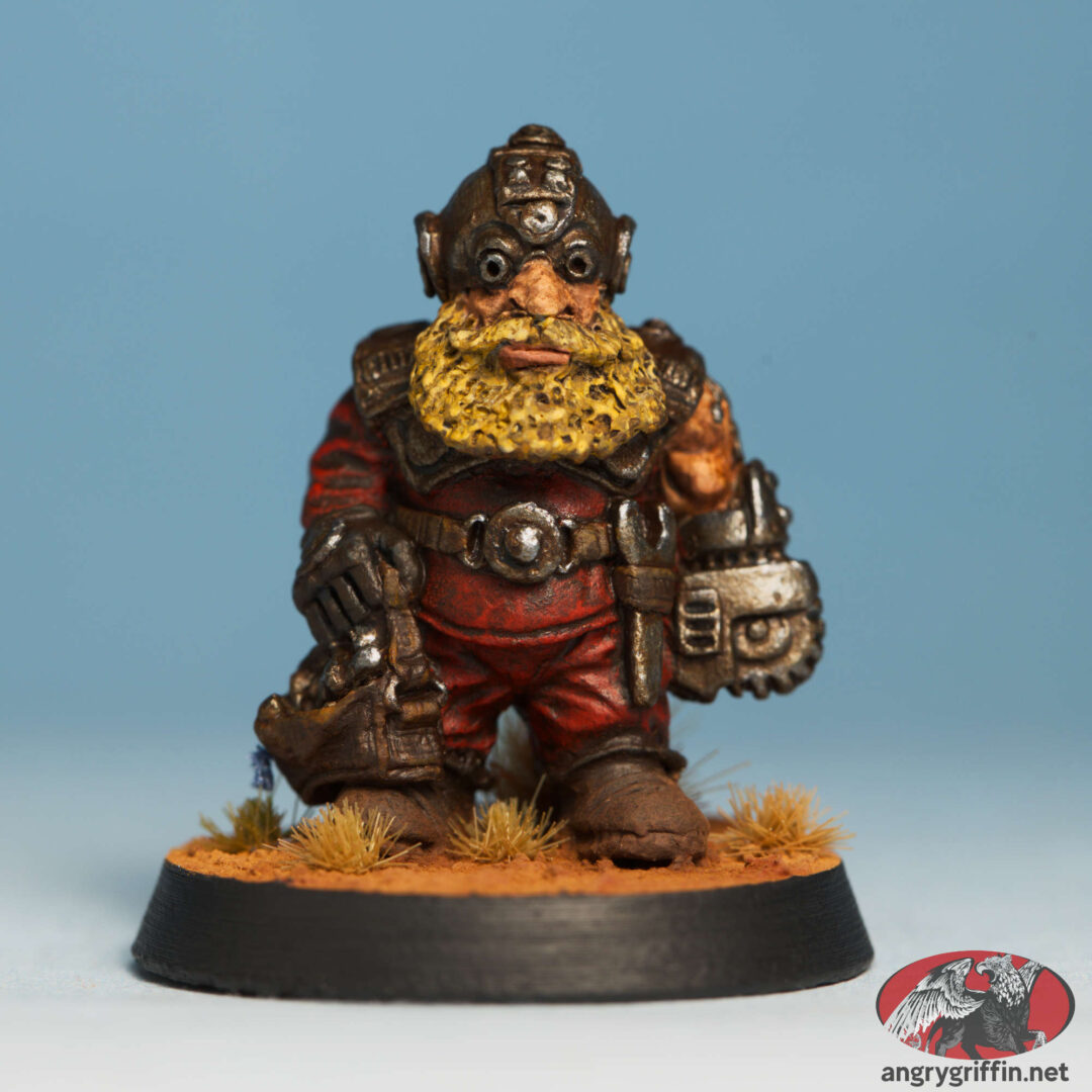 This metal Rogue Trader miniature was one of the original Mechanicus sculpts by Bob Olley. I can’t make out the