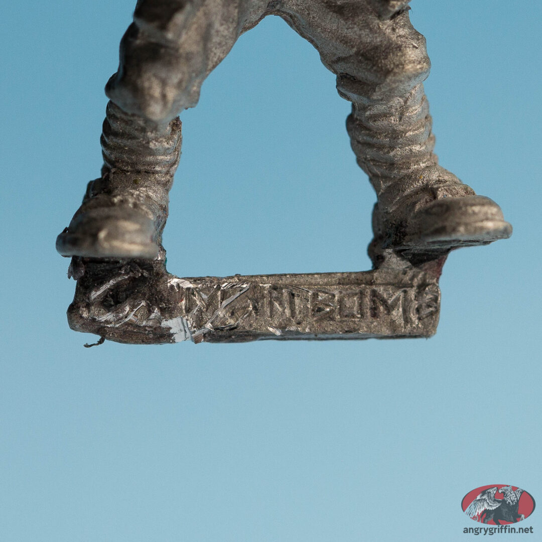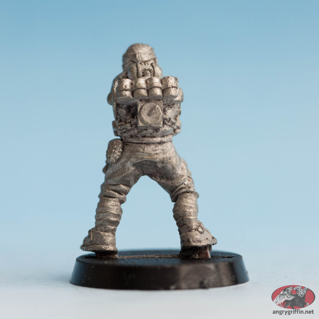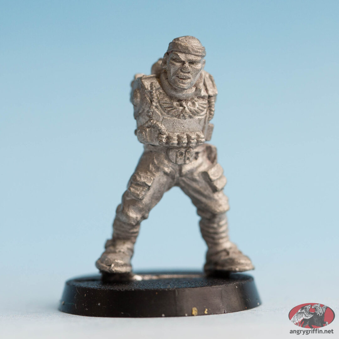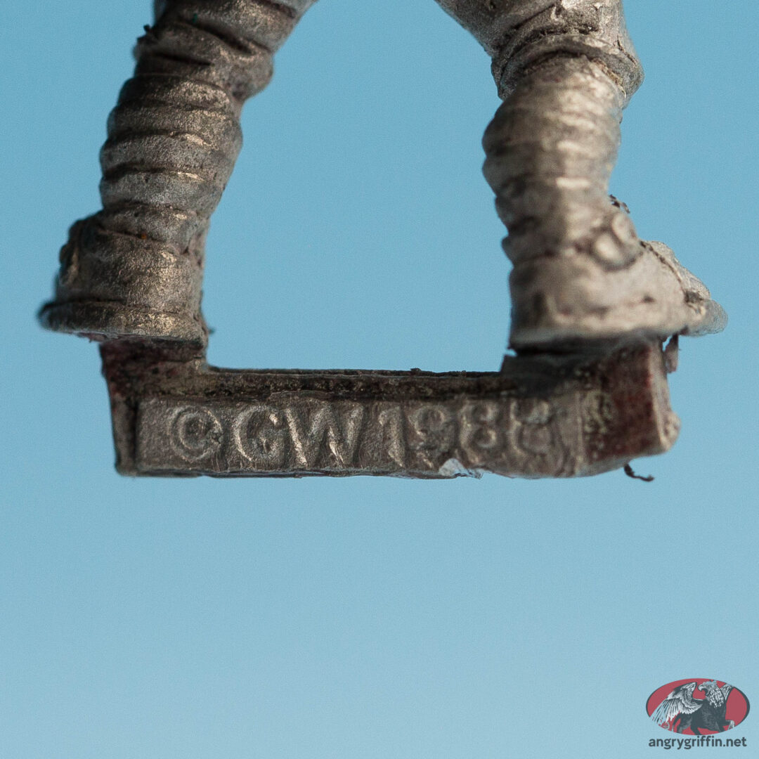 This Warhammer 40K Rogue Trader Imperial Guard miniature can be found in the Autumn 1989 trade catalogue under 072033’s “Personality Figures” section. White Dwarf #110 gives sculpting credit to Mark Copplestone.