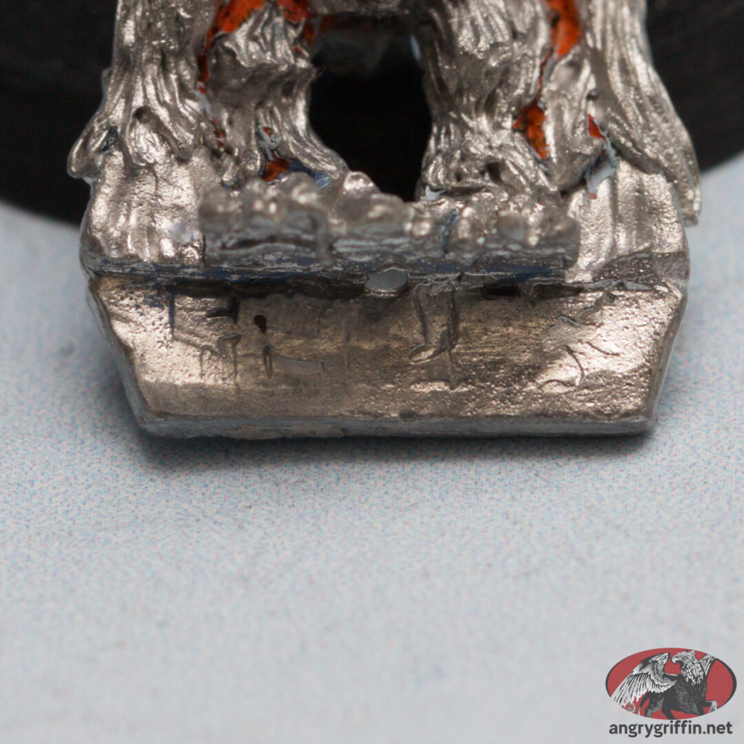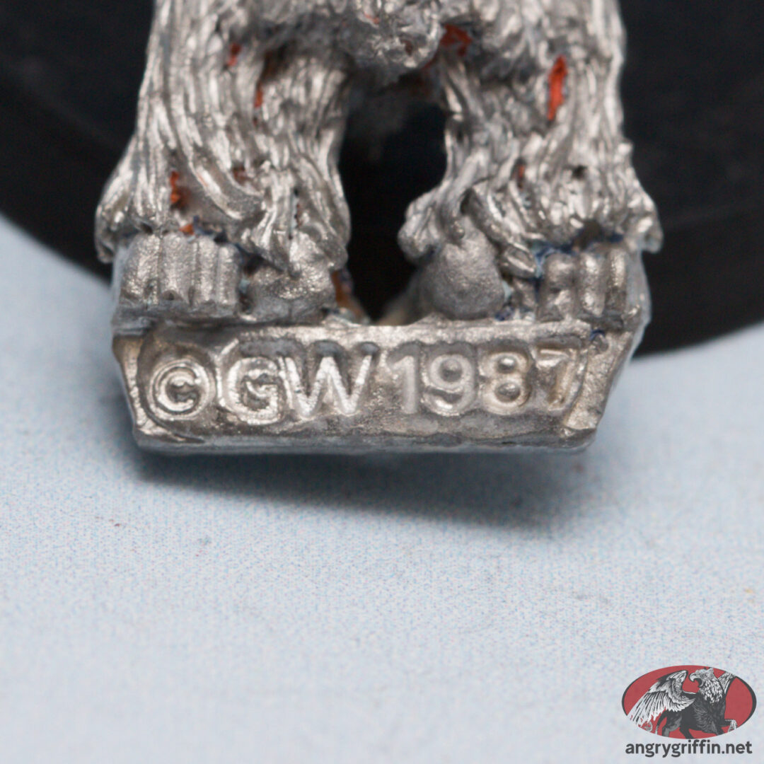 This little metal miniature was one of the Warhammer Fantasy Battle Chaos Familiars and went by the name Beastling. It can be found in the 1991 Red catalogue with part number 073128/52B. In that catalogue it shows that it was sculpted by Jes Goodwin, and the tab shows that it was done in 1987.